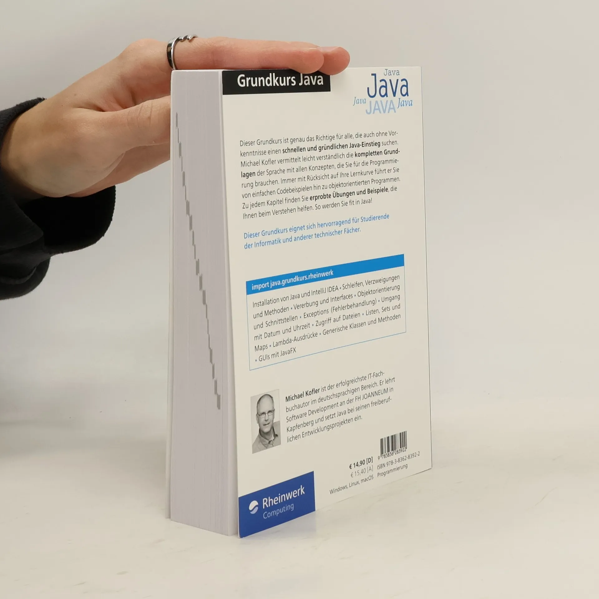 Java-Grundlagen kompakt Java ist das Fundament der modernen Softwarentwicklung und Grundlage unzähliger IT-Projekte. Michael Kofler führt Sie in die Programmiersprache ein und vermittelt alle Konzepte, die Sie für den Einstieg brauchen. Von einfachen Beispielen bis zum objektorientierten Programm finden Sie alles übersichtlich und auf den Punkt präsentiert. Aktuell zu Java LTS 17. Eine kompakte Einführung in Java, Auf einen Objektorientierte Programmierung, Generics, Vererbung, Bibliotheken und mehr, Mit Codebeispielen, Übungen und Lösungen zum Selbststudium, Aus dem Sprachgrundlagen, Installation von Java und IntelliJ IDEA, Schleifen, Verzweigungen und Methoden, Objektorientierung, Vererbungen und Schnittstellen, Vererbung und Interfaces, Exceptions (Fehlerbehandlung), Umgang mit Datum und Uhrzeit, Zugriff auf Dateien, Listen, Sets und Maps, Lambda-Ausdrücke, Generische Klassen und Methoden, Einführung in GUIs mit JavaFX,