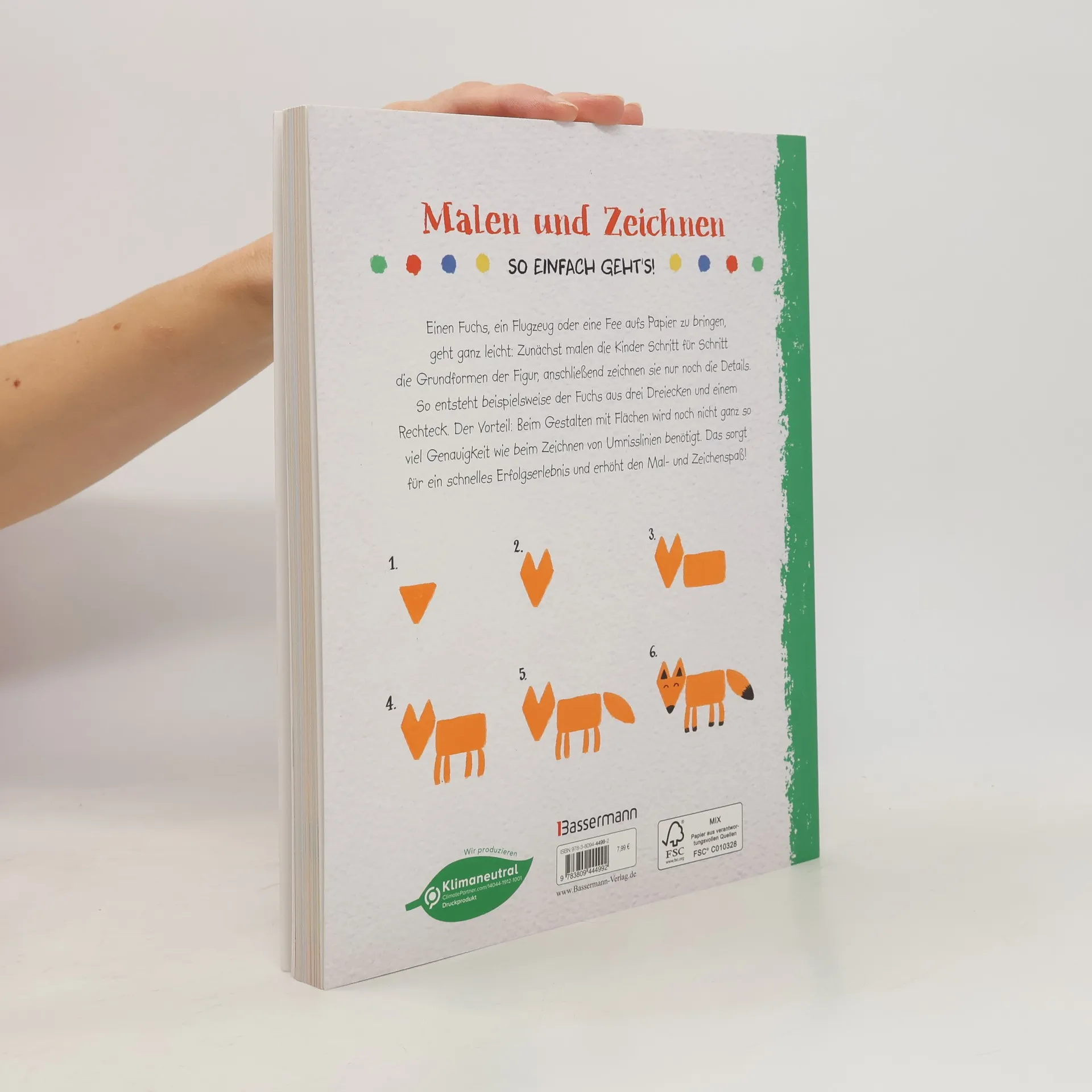 Elefant, Blume, Rakete, Schloss oder Einhorn - diese Zeichenschule für Kinder ab 4 Jahren bietet über 100 Motive zum Nachzeichnen. Das geht ganz leicht: Zunächst werden Schritt für Schritt die Grundformen der Figur gemalt, anschließend folgen die Details. So entsteht z.B. aus drei Dreiecken und einem Quadrat ein Fuchs. Der Vorteil: Beim Gestalten mit Flächen wird noch nicht ganz so viel Planung und Genauigkeit wie beim Zeichnen von Umrisslinien benötigt. Das erhöht das Erfolgserlebnis der kleinen Zeichenkünstler und den Spaß. Ausstattung: durchgehend farbige Abbildungen