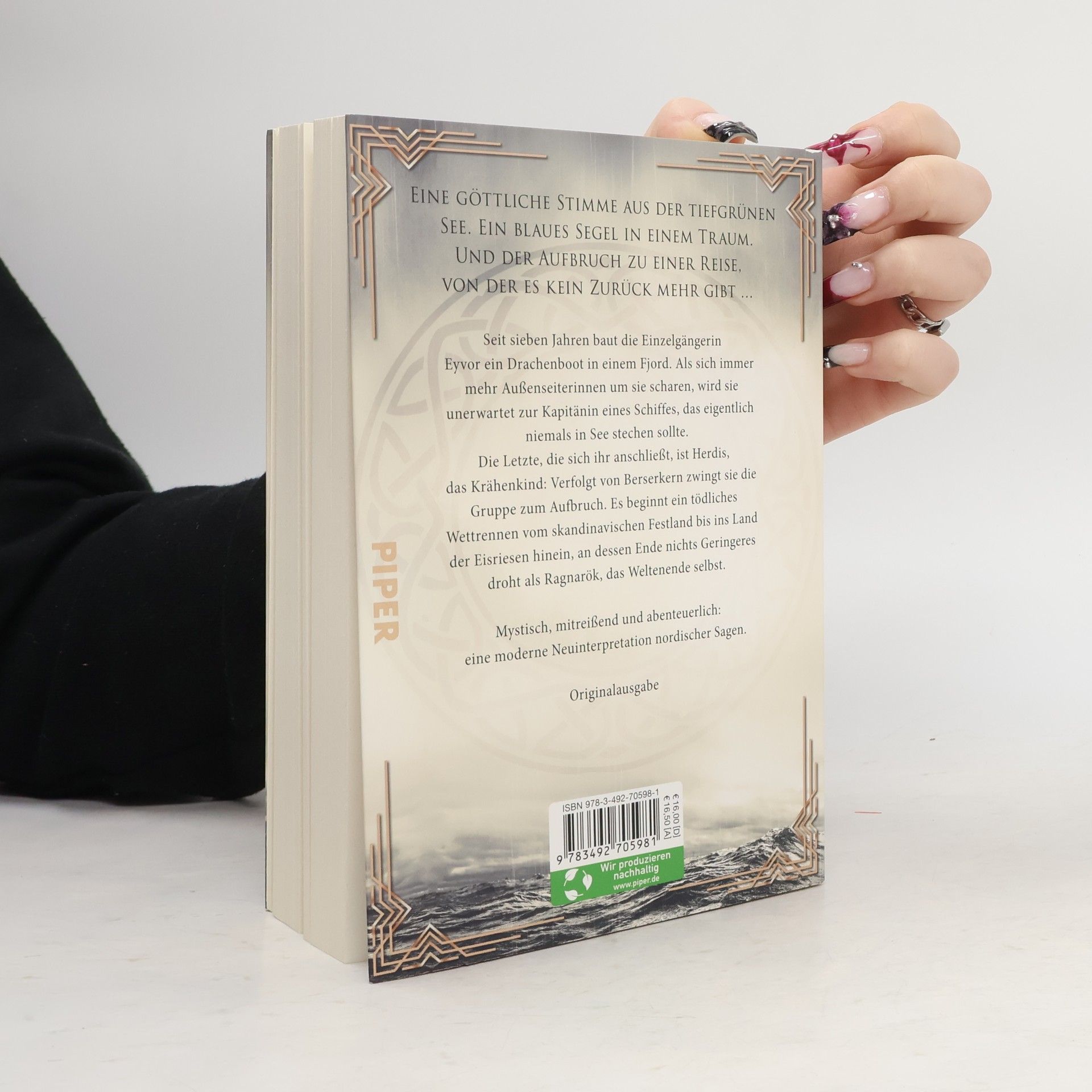 EINE GÖTTLICHE STIMME AUS DER TIEFGRÜNEN SEE. EIN BLAUES SEGEL IN EINEM TRAUM. UND DER AUFBRUCH ZU EINER REISE, VON DER ES KEIN ZURÜCK MEHR GIBT...Seit sieben Jahren baut die Einzelgängerin Eyvor ein Drachenboot in einem Fjord. Als sich immer mehr Außenseiterinnen um sie scharen, wird sie unerwartet zur Kapitänin eines Schiffes, das eigentlich niemals in See stechen sollte.Die Letzte, die sich ihr anschließt, ist Herdis, das Krähenkind: Verfolgt von Berserkern zwingt sie die Gruppe zum Aufbruch. Es beginnt ein tödliches Wettrennen vom skandinavischen Festland bis ins Land der Eisriesen hinein, an dessen Ende nichts Geringeres droht als Ragbarök, das Weltende selbst.Mystisch, mitreißend und abenteuerlich: eine moderne Neuinterpretation nordischer Sagen.
