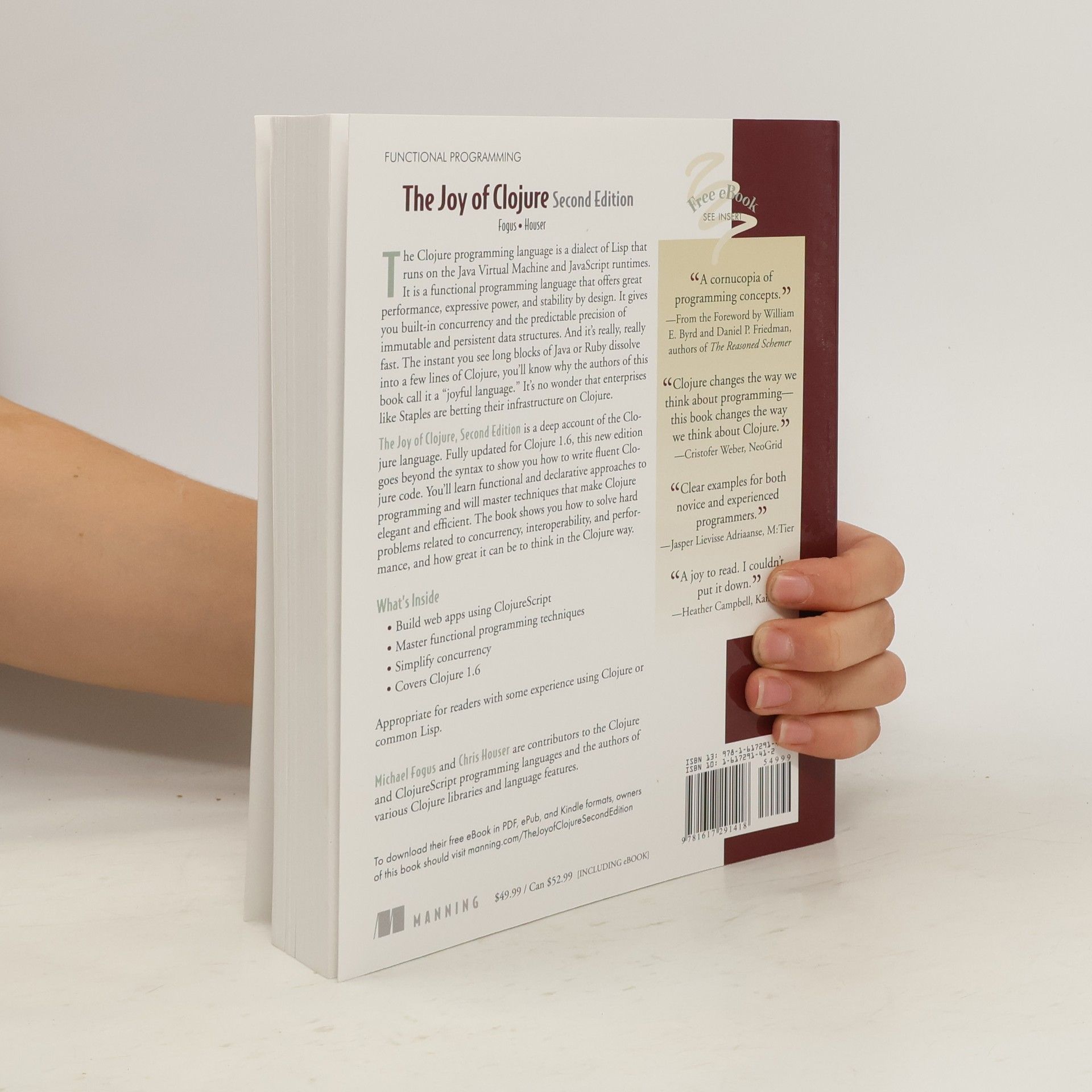 'The Joy of Clojure', 2nd edition, has been fully updated to cover the new and improved features of Clojure 1.5. It goes beyond the syntax and tells the 'why' of Clojure and shows how to write fluent, idiomatic Clojure code. Readers will learn to approach programming challenges from a functional perspective and master the Lisp techniques that make Clojure so efficient and elegant. It also tackles hard software areas like concurrency, interoperability, performance, and more