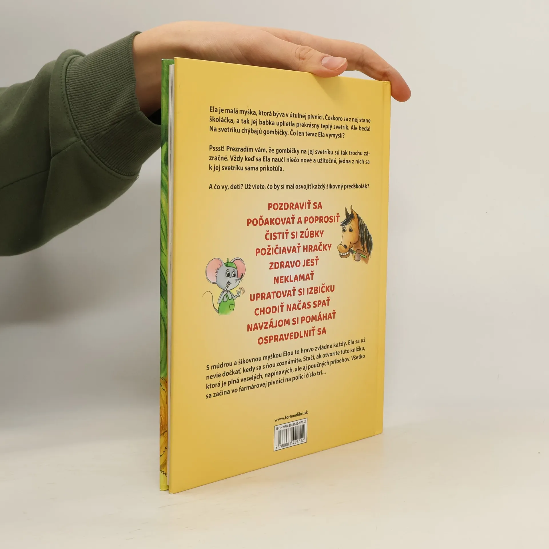 Ela je malá myška, ktorá býva v útulnej farmárovej pivnici. Čoskoro sa z nej stane školáčka, a tak jej babka upletie prekrásny teplý svetrík. Ale beda! Na svetríku chýbajú gombičky. Čo len teraz Ela vymyslí? Pssst! Prezradím vám, že gombičky na jej svetríku sú tak trochu zá-zračné. Zakaždým keď sa Ela naučí niečo nové a užitočné, jedna z nich sa k jej svetríku sama prikotúľa. A čo vy, deti? Už viete, čo by si mal osvojiť každý šikovný predškolák?