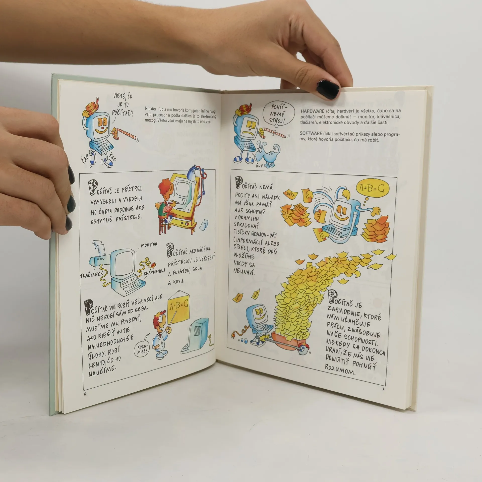 Zúčastníte sa spolu s Lenkou, Tomášom a psom Bonym na ich prvých stretnutiach s počítačmi. Pomocou vtipných obrázkov a zasväteného slovného výkladu môžete poznávať zaujímavý a zábavný svet výpočtovej techniky. V knihe sa dozviete niečo o histórii výpočtovej techniky, základných počítačových pojmoch, súčasnom využití počítačov v obchode, školách a domácnostiach, využívaní počítačov v budúcnosti.