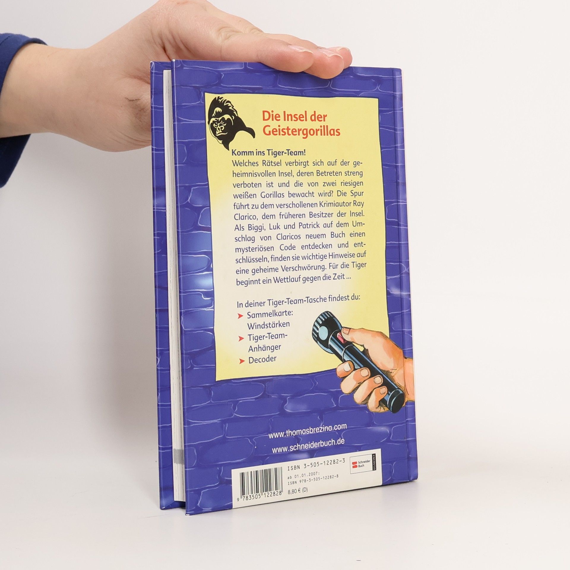 Rez.: Im 39. Band der eingeführten Reihe (vgl. Band 38 "Die Stunde des Hexenmeisters", BA 6/06) dürfen die 3 Tiger Biggi, Luk und Patrick ein paar schulfreie Tage bei Onkel Marvin verbringen, der Polizeiinspektor im kleinen Küstenörtchen St. Margaret ist. Onkel Marvin warnt die Kinder eindringlich vor der kleinen Insel, die mit dem Fernglas von weitem zu erkennen ist, denn dort habe sich vor kurzem Schreckliches ereignet. Natürlich ist der Spürsinn der Tiger nun geweckt, und schon bald machen sich die Freunde mit einem Segelboot auf in Richtung Insel. Dort werden die Ahnungslosen bereits von finsteren Gorillas und anderen Gefahren erwartet ... - Reihenüblich darf auch bei diesem Fall wieder mitgeknobelt werden, dafür gibt es in der Tiger-Team-Tasche den obligatorischen Decoder, eine Sammelkarte für Windstärken und einen Tiger-Team-Anhänger. Zur Fortsetzung. (Mbg)