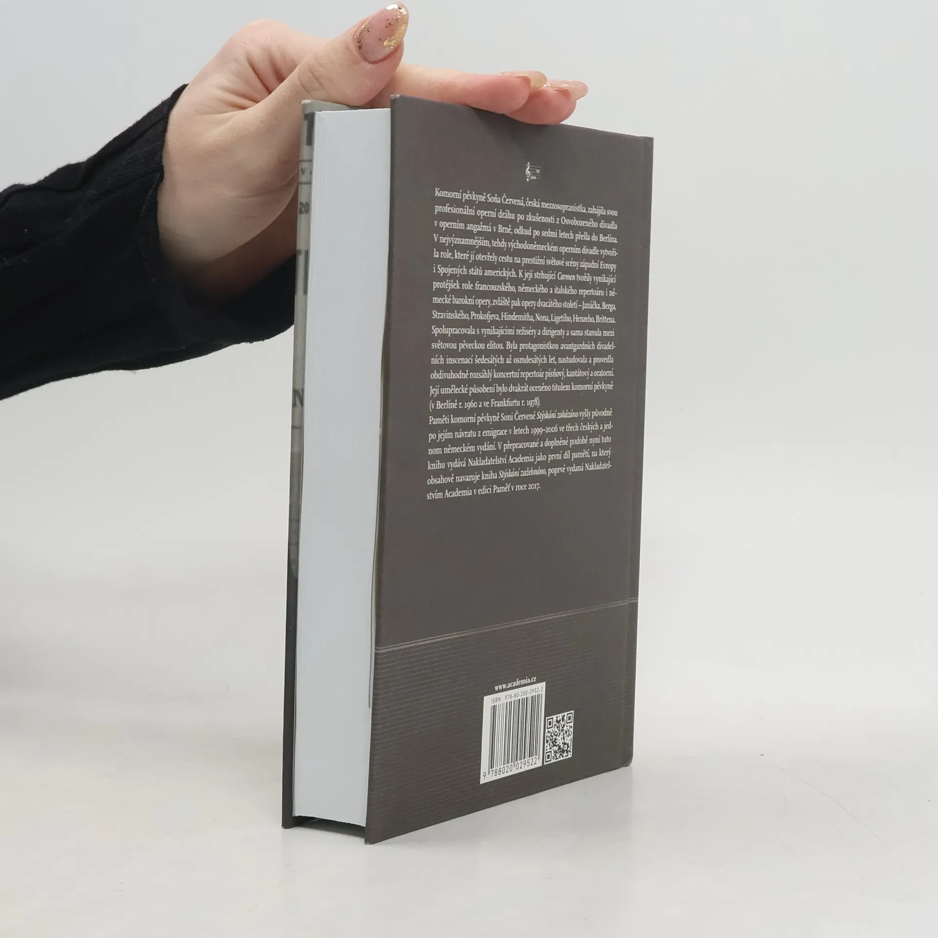 Komorní pěvkyně Soňa Červená, česká mezzosopranistka, zahájila svou profesionální operní dráhu po zkušenosti z Osvobozeného divadla v operním angažmá v Brně, odkud po sedmi letech přešla do Berlína. V nejvýznamnějším, tehdy východoněmeckém operním divadle vytvořila role, které jí otevřely cestu na prestižní světové scény západní Evropy i Spojených států amerických. K její strhující Carmen tvořily vynikající protějšek role francouzského, německého a italského repertoáru i německé barokní opery, zvláště pak opery dvacátého století – Janáčka, Berga, Stravinského, Prokofjeva, Hindemitha, Nona, Ligetiho, Henzeho, Brittena. Spolupracovala s vynikajícími režiséry a dirigenty a sama stanula mezi světovou pěveckou elitou. Byla protagonistkou avantgardních divadelních inscenací šedesátých až osmdesátých let, nastudovala a provedla obdivuhodně rozsáhlý koncertní repertoár písňový, kantátový a oratorní. Její umělecké působení bylo dvakrát oceněno titulem komorní pěvkyně (v Berlíně r. 1960 a ve Frankfurtu r. 1978). Paměti komorní pěvkyně Soni Červené Stýskání zakázáno vyšly původně po jejím návratu z emigrace v letech 1999–2006 ve třech českých a jednom německém vydání. V přepracované a doplněné podobě nyní tuto knihu vydává Nakladatelství Academia jako první díl pamětí, na který obsahově navazuje kniha Stýskání zažehnáno, poprvé vydaná Nakladatelstvím Academia v edici Paměť v roce 2017.