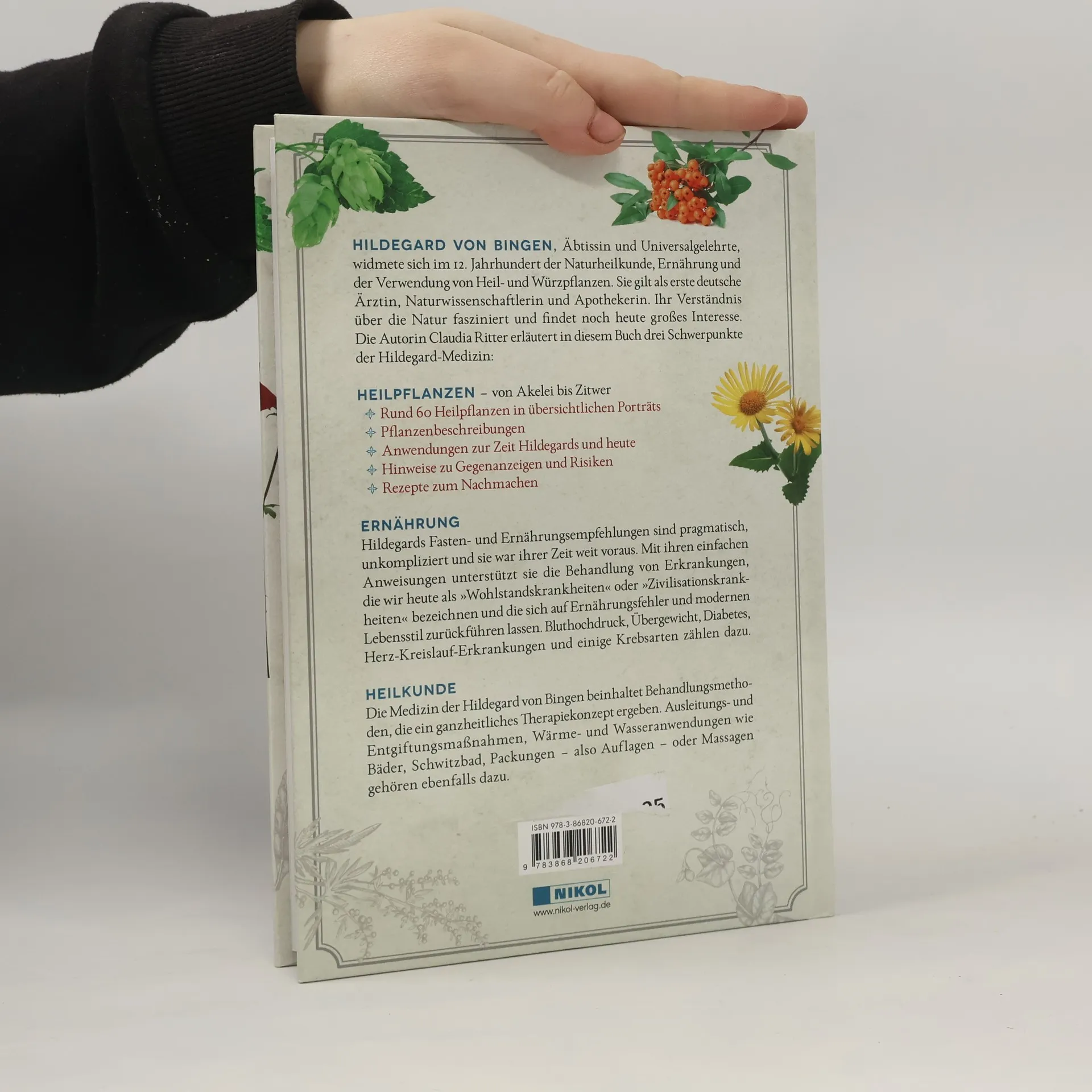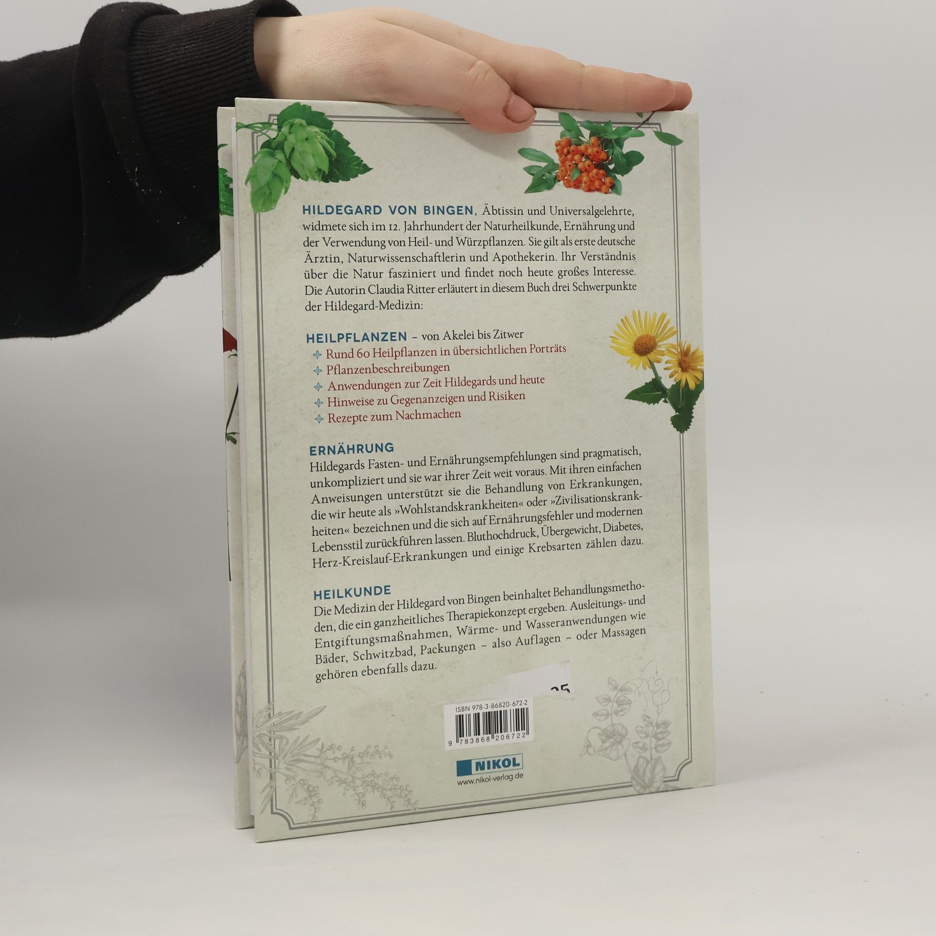Hildegard von Bingen, Äbtissin und Universalgelehrte, widmete sich im 12. Jahrhundert der Naturheilkunde, Ernährung und der Verwendung von Heil- und Würzpflanzen. Sie gilt als erste deutsche Ärztin, Naturwissenschaftlerin und Apothekerin. Ihr Verständnis über die Natur fasziniert und findet noch heute großes Interesse. Die Autorin Claudia Ritter erläutert in diesem Buch drei Schwerpunkte der Hildegard-Medizin: HEILPFLANZEN – von Akelei bis Zitwer • Rund 60 Heilpflanzen in übersichtlichen Porträts • Pflanzenbeschreibungen • Anwendungen bei Hildegard und heute • Hinweise zu Gegenanzeigen und Risiken • Rezepte zum Nachmachen ERNÄHRUNG Hildegards Fasten- und Ernährungsempfehlungen sind pragmatisch, unkompliziert und sie war ihrer Zeit weit voraus. Mit ihren einfachen Anweisungen unterstützt sie die Behandlung von Erkrankungen, die wir heute als „Wohlstandskrankheiten“ oder „Zivilisationskrankheiten“ bezeichnen und die sich auf Ernährungsfehler und modernen Lebensstil zurückführen lassen. Bluthochdruck, Übergewicht, Diabetes mellitus, Herz-Kreislauf-Erkrankungen und einige Krebsarten zählen dazu. HEILKUNDE Die Medizin der Hildegard von Bingen beinhaltet Behandlungsmethoden, die ein ganzheitliches Therapiekonzept ergeben. Ausleitungs- und Entgiftungsmaßnahmen, Wärme- und Wasseranwendungen wie Bäder, Schwitzbad, Packungen – also Auflagen – oder Massagen gehören ebenfalls dazu.
