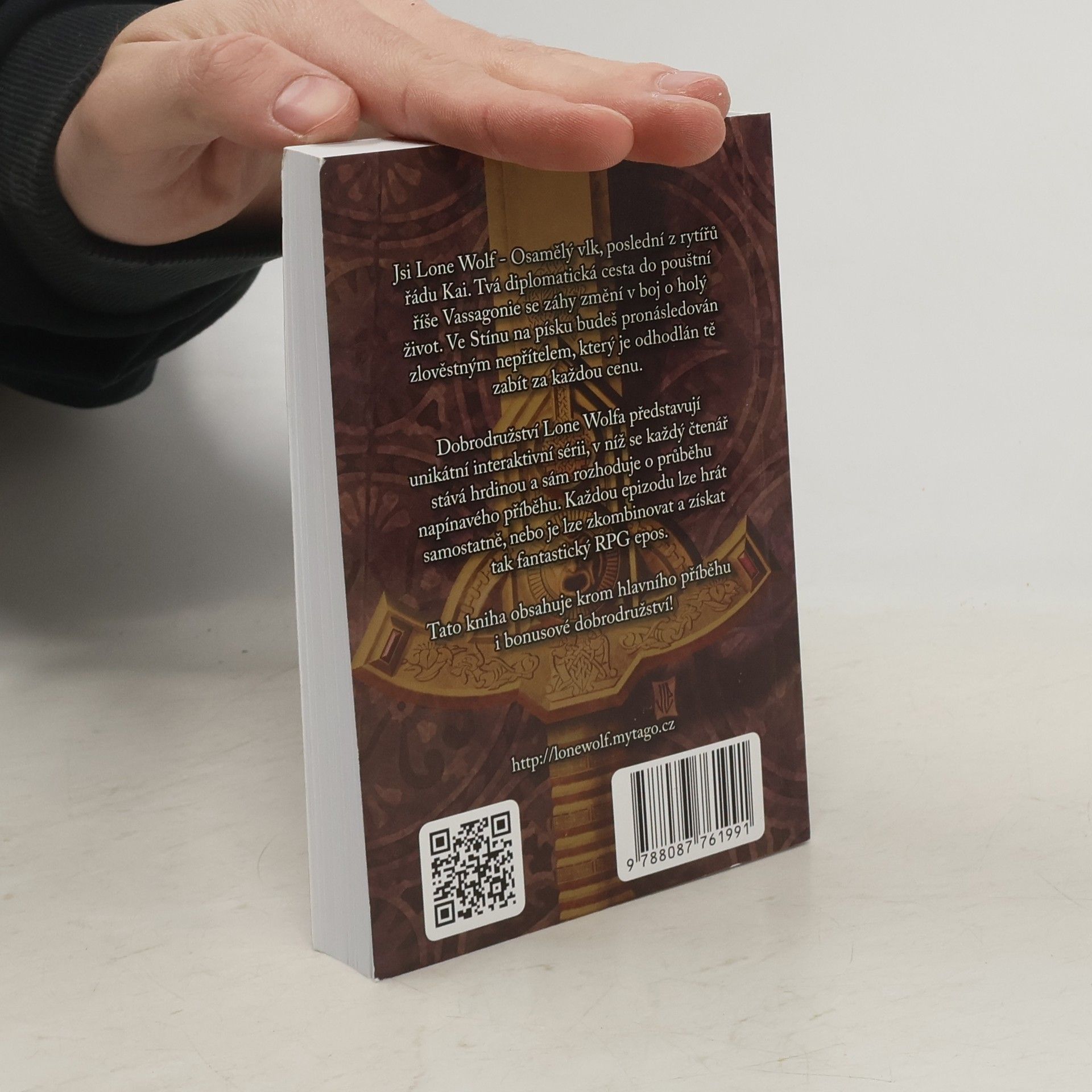 Jsi Lone Wolf - Osamělý vlk, poslední z rytířů řádu Kai. Tvá diplomatická cesta do pouštní říše Vassagonie se záhy změní v boj o holý život. Ve Stínu na písku budeš pronásledován zlověstným nepřítelem, který je odhodlán tě zabít za každou cenu. Dobrodružství Lone Wolfa představují unikátní interaktivní sérii, v níž se každý čtenář stává hrdinou a sám rozhoduje o průběhu napínavého příběhu. Každou epizodu lze hrát samostatně, nebo je lze zkombinovat a získat tak fantastický RPG epos. Kniha obsahuje krom hlavního příběhu i bonusové dobrodružství!