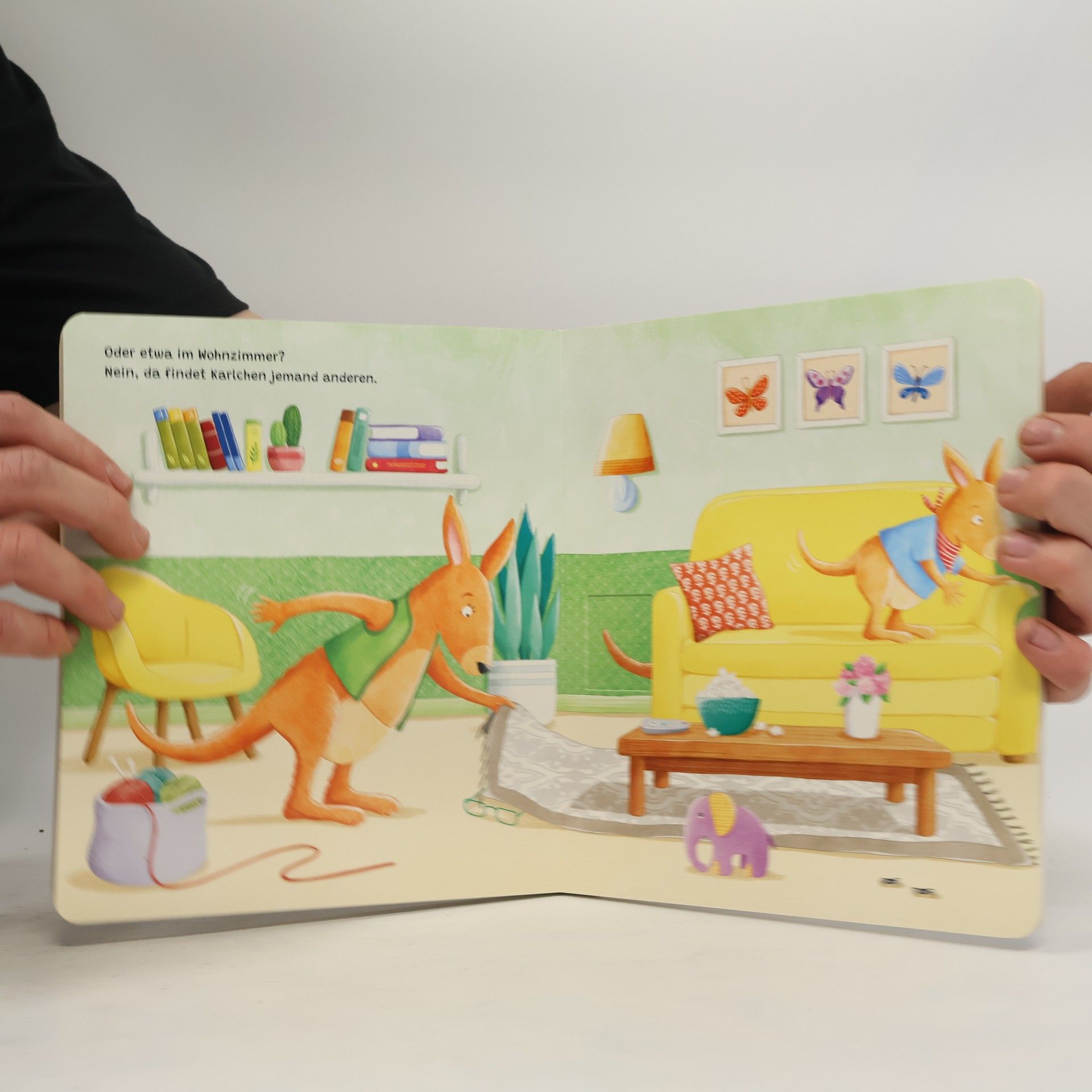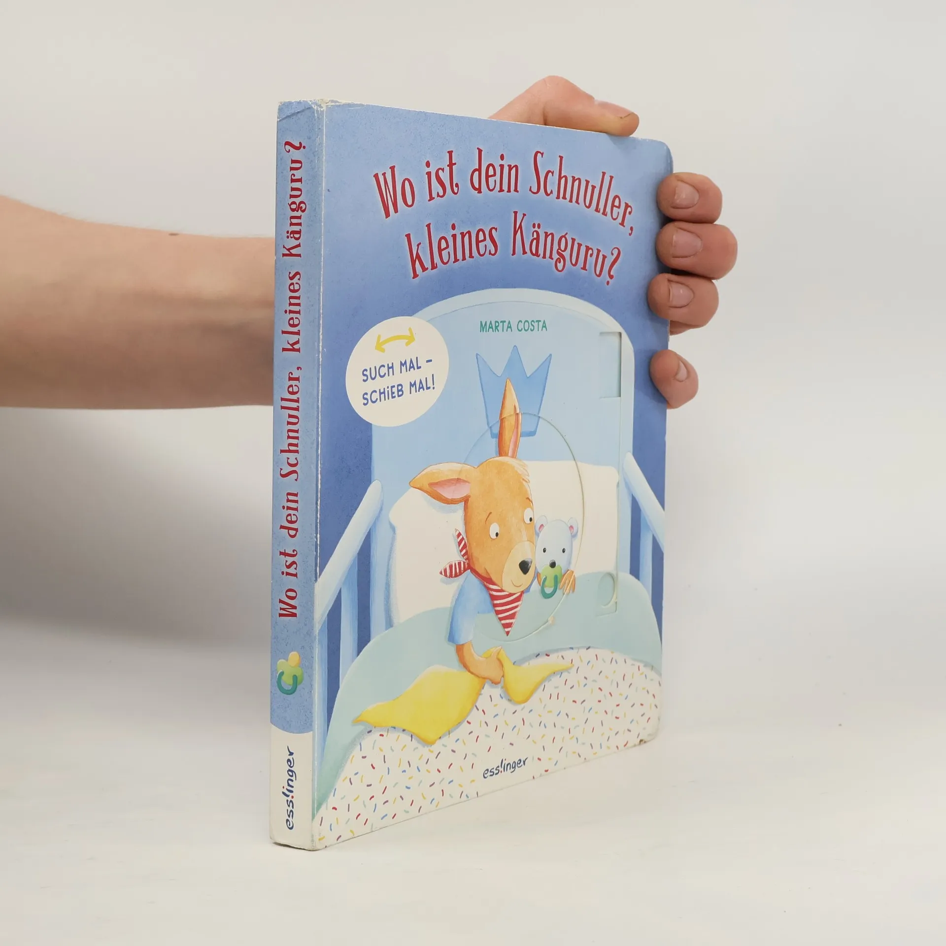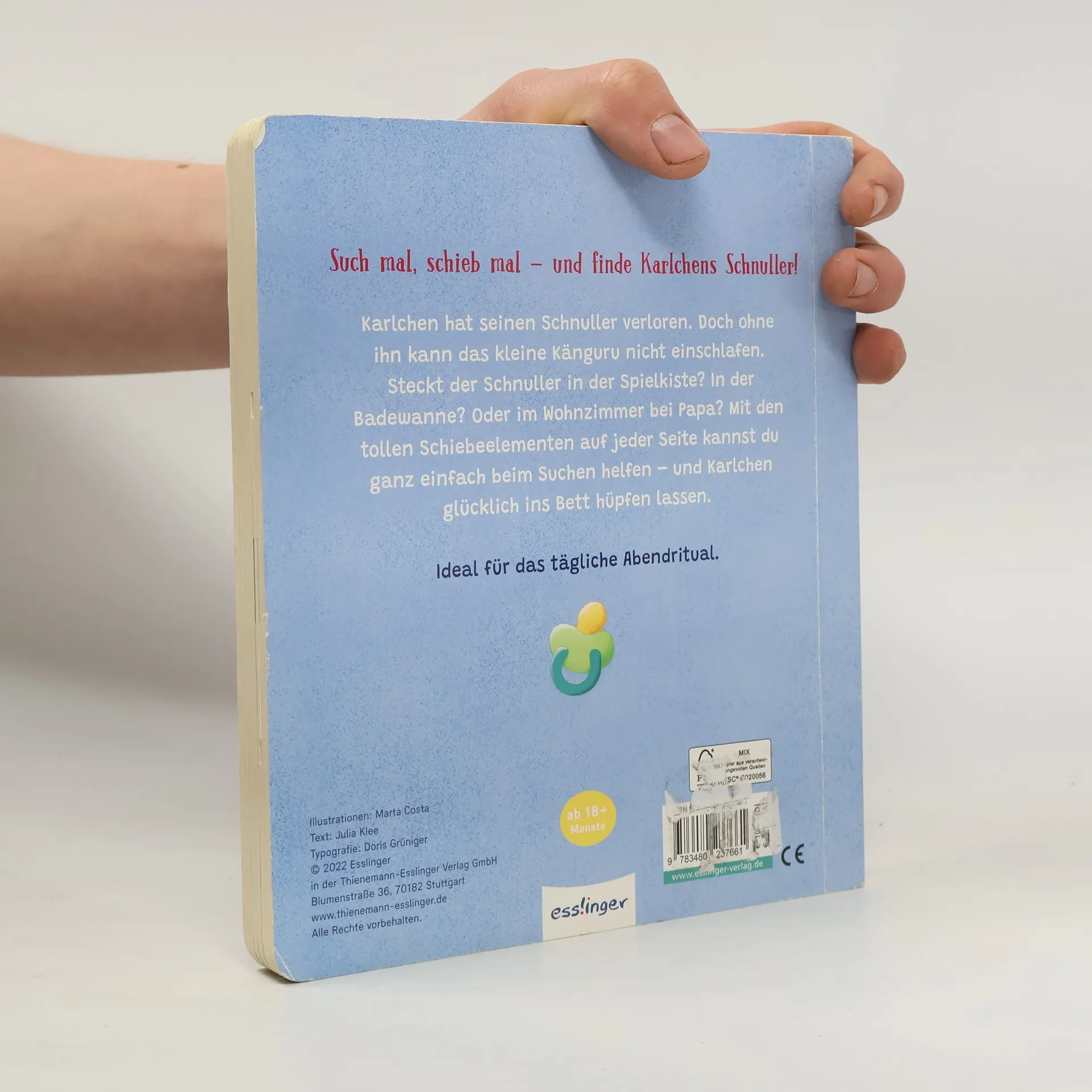 Mit diesem interaktiven Mitmachbuch können schon die Kleinsten ab 18 Monaten mithelfen und das kleine Känguru auf der Suche nach seinem Schnuller unterstützen. Auf dem Cover und nach jedem Umblättern wartet ein tolles Schiebelement , das kinderleicht hin- und herbewegt werden kann. Es ist Zeit zu schlafen, Karlchen ist kängurumüde. Doch er hat seinen Schnuller verloren ! Ohne ihn hüpft Karlchen nicht ins Bett … Steckt der Schnuller in der Spielzeugkiste, in der Küche, in der Badewanne oder etwa im Wohnzimmer bei Papa Känguru? Ein großer Spaß für kleine Entdecker und alle, die ihren Schnuller (bald nicht mehr) brauchen. Liebevoll in Szene gesetzte Gutenachtgeschichte, mit vielen tollen Details zum Immer-wieder-Spielen. Dieses interaktive Mitmachbuch ist der ideale Begleiter für das tägliche Abendritual und fördert dabei ganz spielerisch Feinmotorik und Sprache .