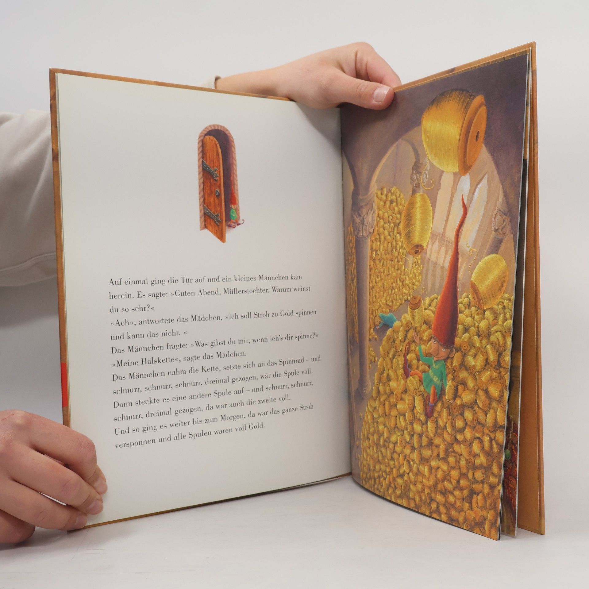 Nacht für Nacht muss die schöne Müllerstochter in einer Kammer eingeschlossen Stroh zu Gold spinnen. Wie zu ihrer Rettung taucht stets ein kleines, hässliches Männlein auf, um die unmögliche Aufgabe zu lösen. Doch der Preis ist hoch, denn in ihrer Not verspricht ihm die Müllerstochter ihr Erstgeborenes. Über ein Jahr später bringt die nun mit dem König Vermählte ein Kind zur Welt. Und als das Männlein wie aus dem Nichts wieder auftaucht, um das Kind mitzunehmen, bleibt der Königin nur eine Möglichkeit, ihr Kind zu retten: Sie muss herausfinden, wie der Gnom heißt. Eines der bekanntesten Märchen der Brüder Grimm mit kunstvollen und ausdrucksstarken Bildern von Kathrin Treuber - zum Sammeln und Verschenken.