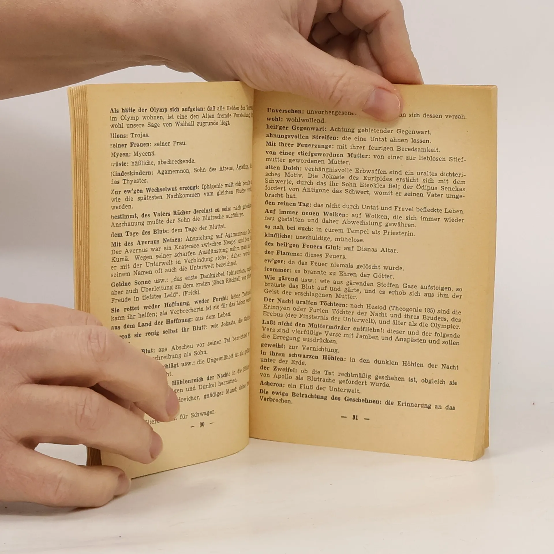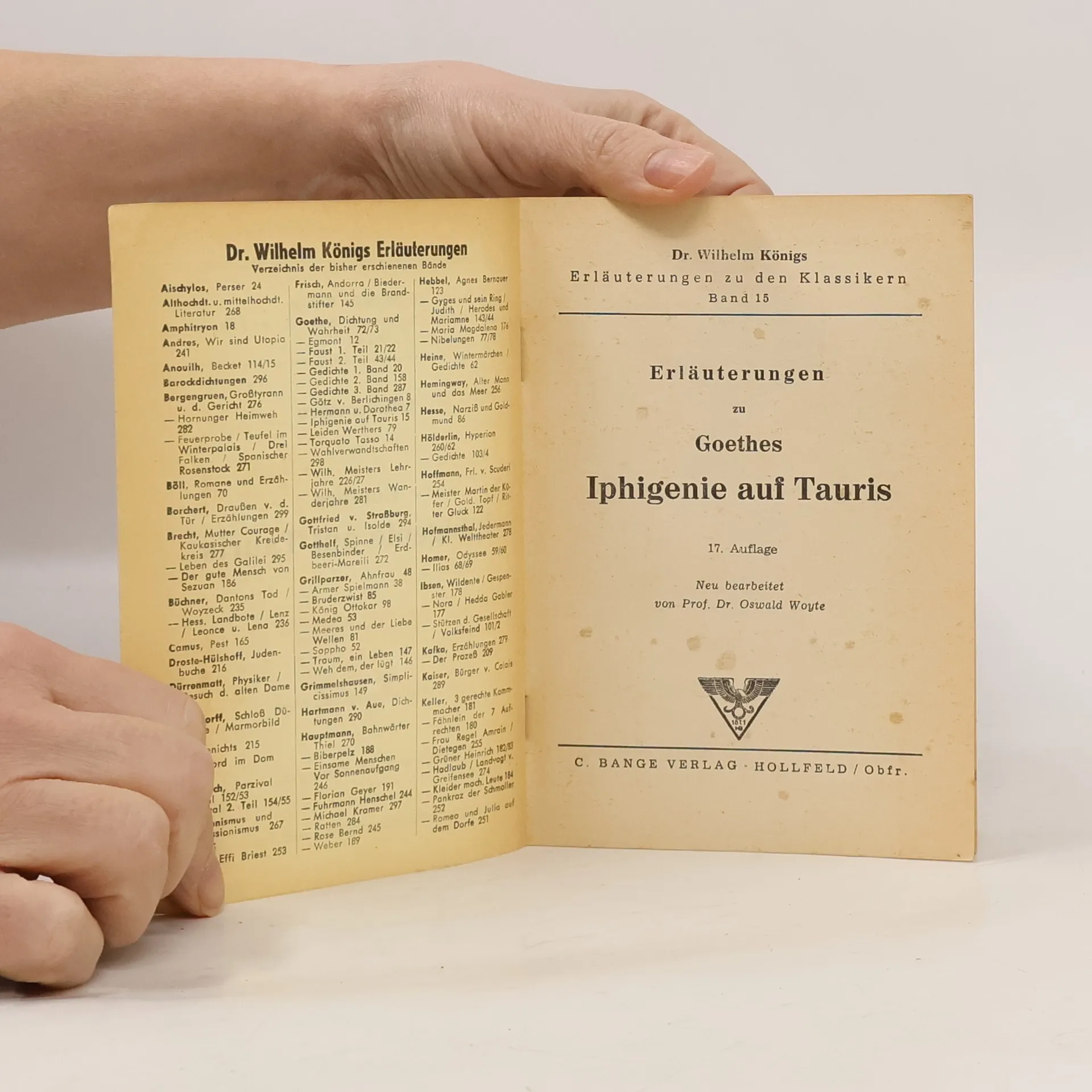 Das Werk knüpft an die alte Sage von Orest an, der den Gattenmord an seiner eigenen Mutter rächen muss. Von den Erinnerungen verfolgt, wird er ruhelos umhergetrieben. Seine Schwester Iphigenie vermag durch reine „Menschlichkeit“ ihrem Bruder zu helfen. Die Seelengrösse der lphigenie verhilft der Tragödie zu Formenschönheit und Vollkommenheit, die sie zur klassischen Dichtung macht. Das Nachwort gibt Aufschluss über das Entstehen des Werkes. Fünf Seiten Anmerkungen helfen dem Schüler.