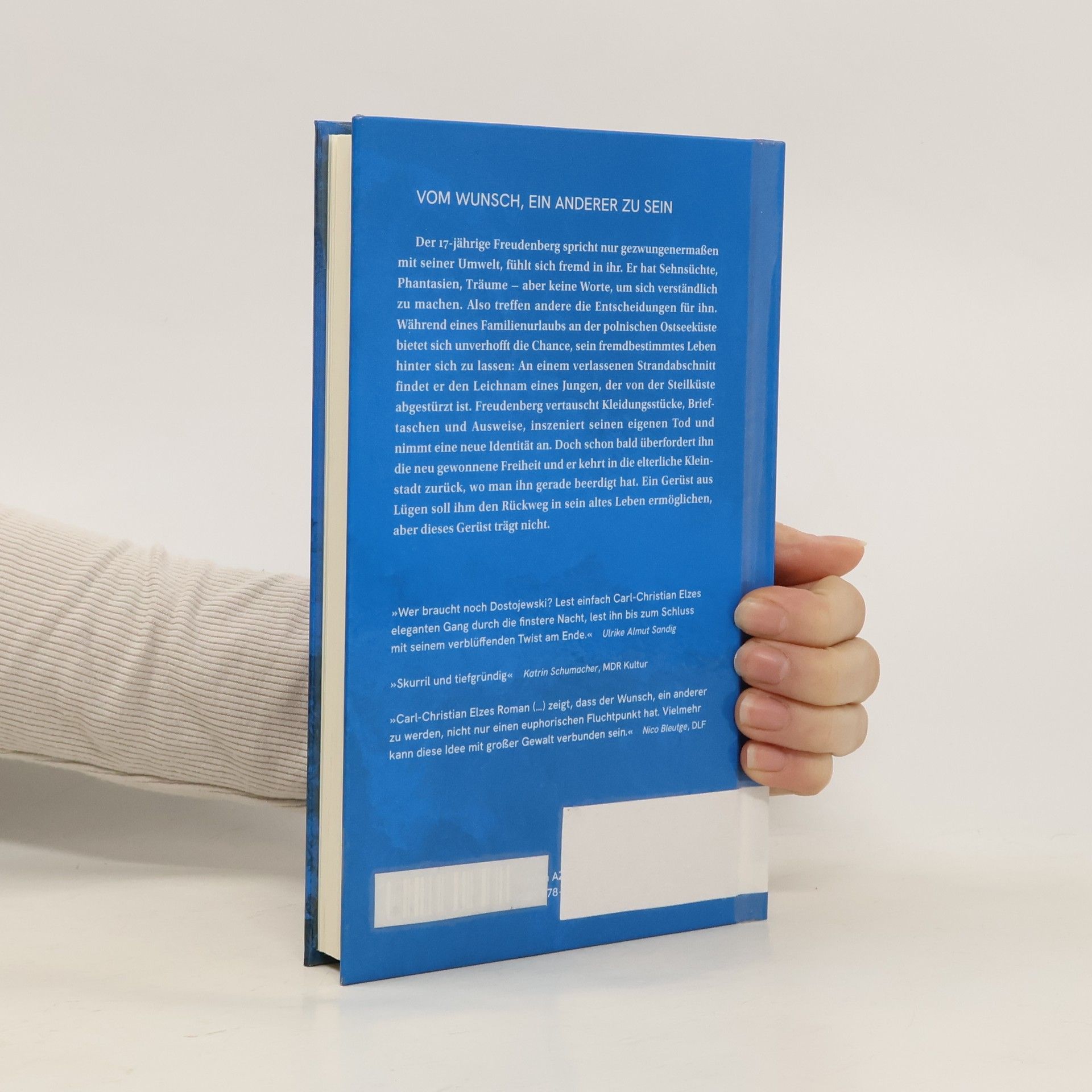 Der 17-jährige Freudenberg spricht nur gezwungenermaßen mit seiner Umwelt, fühlt sich fremd in ihr. Er hat Sehnsüchte, Phantasien, Träume – doch ihm fehlen die Worte, um sich verständlich zu machen. Also treffen andere die Entscheidungen für ihn. Während eines Familienurlaubs an der polnischen Ostseeküste bietet sich unverhofft die Chance, sein fremdbestimmtes Leben hinter sich zu lassen: An einem verlassenen Strandabschnitt findet er den Leichnam eines Jungen, der von der Steilküste ab- gestürzt ist. Freudenberg vertauscht Kleidungsstücke, Brieftaschen und Ausweise, inszeniert seinen eigenen Tod und nimmt eine neue Identität an. Doch schon bald überfordert ihn die neu gewonnene Freiheit und er kehrt in die elterliche Kleinstadt zurück, wo man ihn gerade beerdigt hat. Ein Gerüst aus Lügen soll ihm den Rückweg in sein altes Leben ermöglichen, aber dieses Gerüst trägt nicht. In seinem sprachlich fulminanten Romandebüt erzählt Carl-Christian Elze von einem fast erwachsenen Kind, das anders ist als die anderen, erzählt von Schuld, Verdrängung und dem unstillbaren Wunsch, ein anderer zu sein.