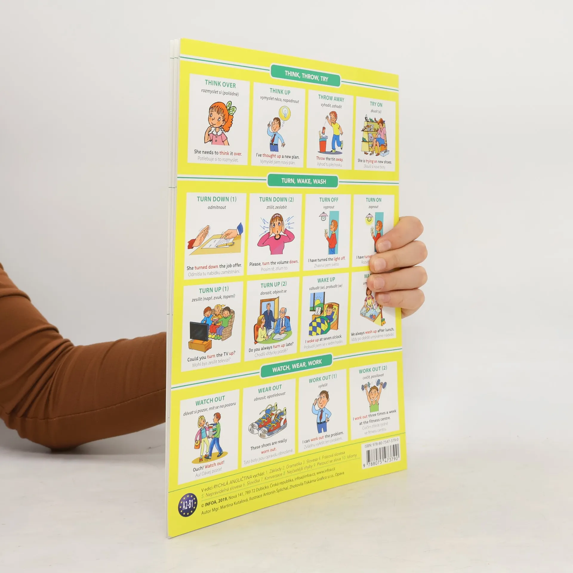 Tato publikace na úrovni A2 - B1 obsahuje přehled základních anglických frázových sloves. Slovesa jsou řazena do přehledných tabulek, ke každému je uveden český význam a příkladová věta s překladem do češtiny. Pro lepší zapamatování je význam slovesa doplněn názornou ilustrací.