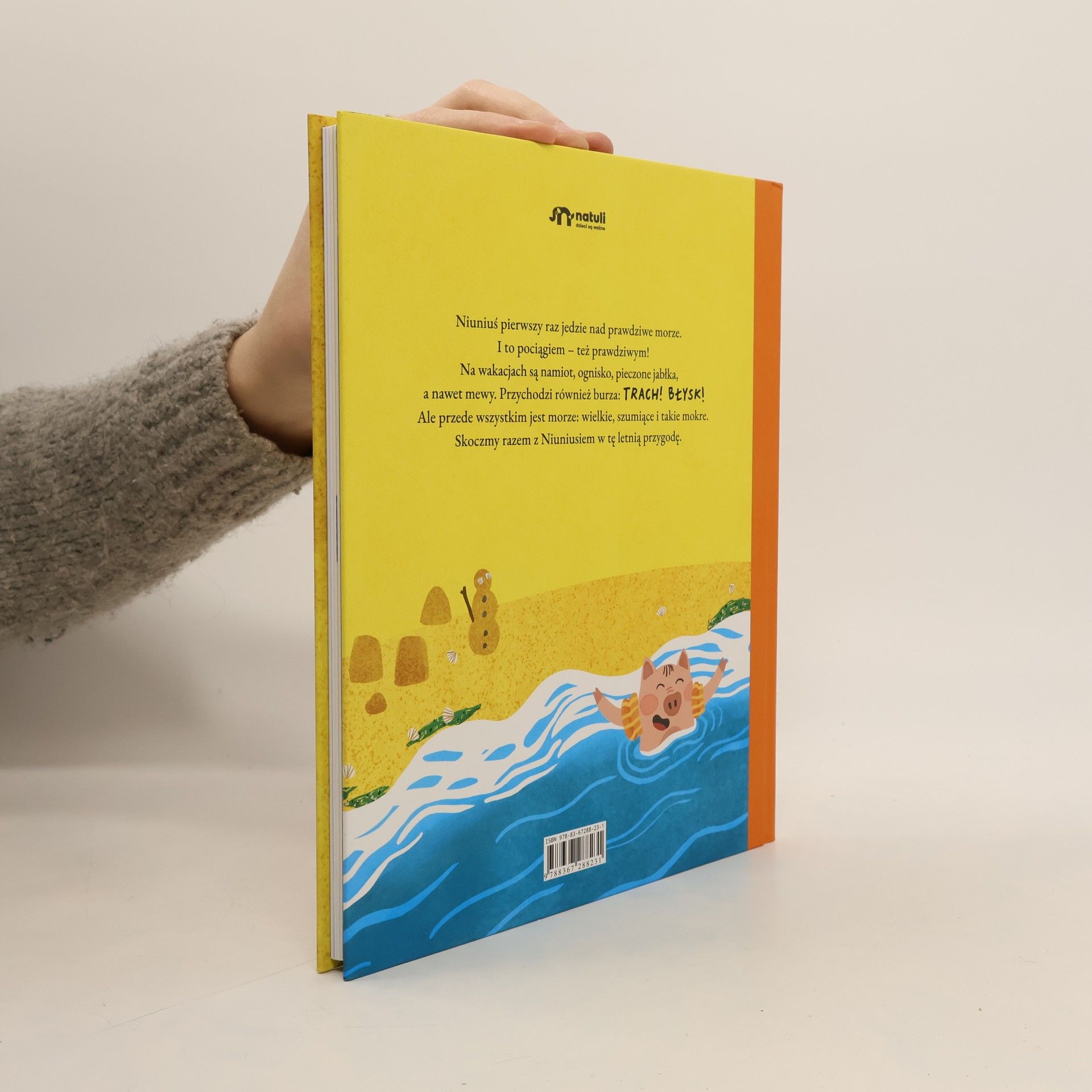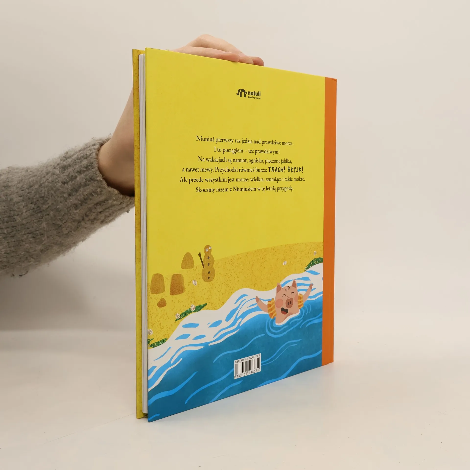 Niuniuś pierwszy raz jedzie nad prawdziwe morze. I to pociągiem – też prawdziwym! Na wakacjach są namiot, ognisko, pieczone jabłka, a nawet komary. Przychodzi też burza: TRACH! BŁYSK! Ale przede wszystkim jest morze: wielkie, szumiące i takie mokre. Skoczmy razem z Niuniusiem w tę letnią przygodę.