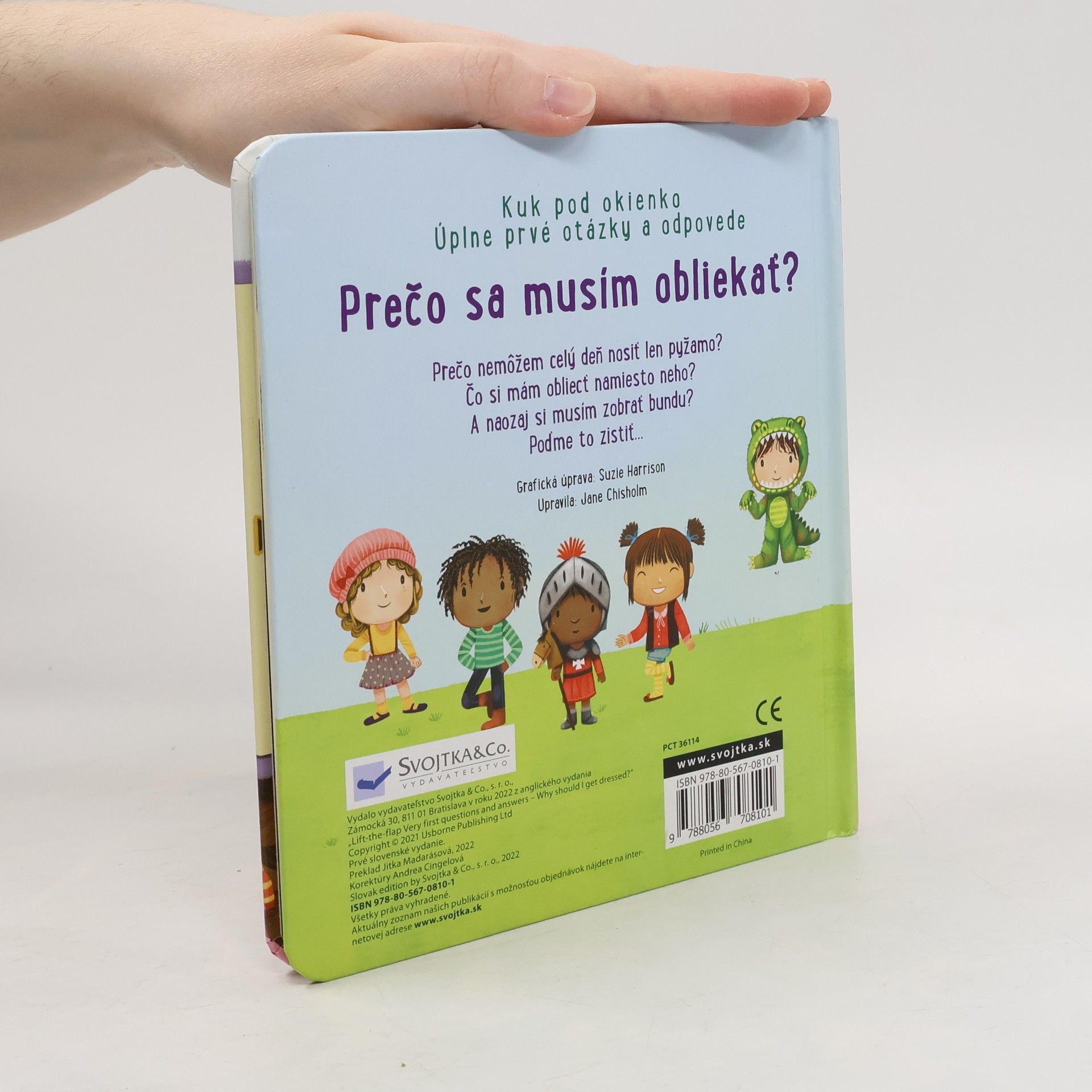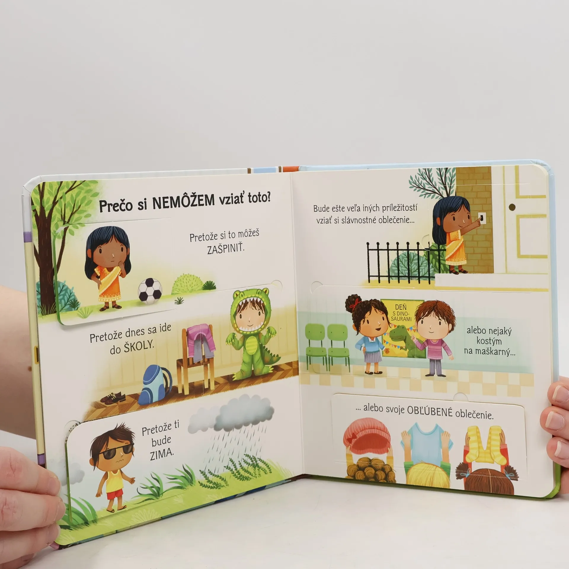Leporelo s odklápacími okienkami jednoducho a zrozumiteľne vysvetľuje, prečo nezostať celý deň v pyžame a aké oblečenie si namiesto neho vybrať. Prečo nemôžem celý deň nosiť len pyžamo? A čo si mám vziať namiesto neho? Táto ilustrovaná knižka s odklápacími okienkami zrozumiteľnou formou deťom vysvetľuje, aké oblečenie je vhodné do konkrétneho počasia alebo pre špeciálnu udalosť. Podnecuje v deťoch záujem o to, aby sa samy a správne rozhodli, čo si oblečú. V tomto roztomilo ilustrovanom leporele nájdu pod okienkami veľa príkladov toho, na čo slúžia rôzne druhy oblečenia alebo doplnkov a čo si práve vziať na seba. Výber vhodného oblečenia bude vďaka tejto knižke o niečo jednoduchší. Na čo slúžia špeciálne cyklistické šortky alebo neoprénová kombinéza? Ako sa obliekala egyptská kráľovná, staroveký Riman alebo Indián? A prečo zvieratá nemusia nosiť žiadne oblečenie? Poďme to všetko zistiť! Slovenské vydanie publikácie vydavateľstva Usborne.