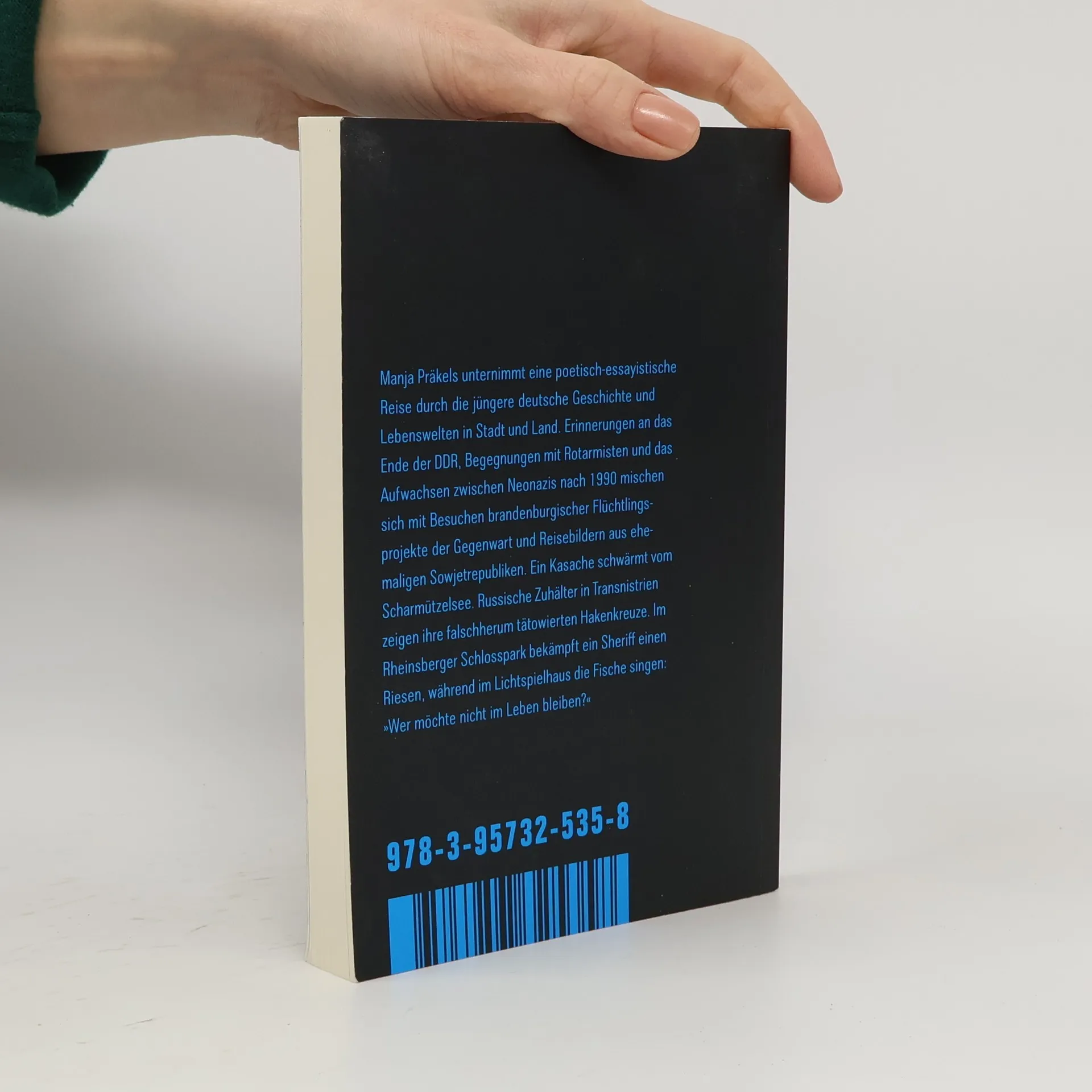 Manja Präkels unternimmt eine poetisch-essayistische Reise durch die jüngere deutsche Geschichte und Lebenswelten in Stadt und Land. Erinnerungen an das Ende der DDR, Begegnungen mit Rotarmisten und das Aufwachsen zwischen Neonazis nach 1990 mischen sich mit Besuchen brandenburgischer Flüchtlingsprojekte der Gegenwart und Reisebildern aus ehemaligen Sowjetrepubliken. Ein Kasache schwärmt vom Scharmützelsee. Russische Zuhälter in Transnistrien zeigen ihre falschherum tätowierten Hakenkreuze. Im Rheinsberger Schlosspark bekämpft ein Sheriff einen Riesen, während im Lichtspielhaus die Fische singen: "Wer möchte nicht im Leben bleiben?"