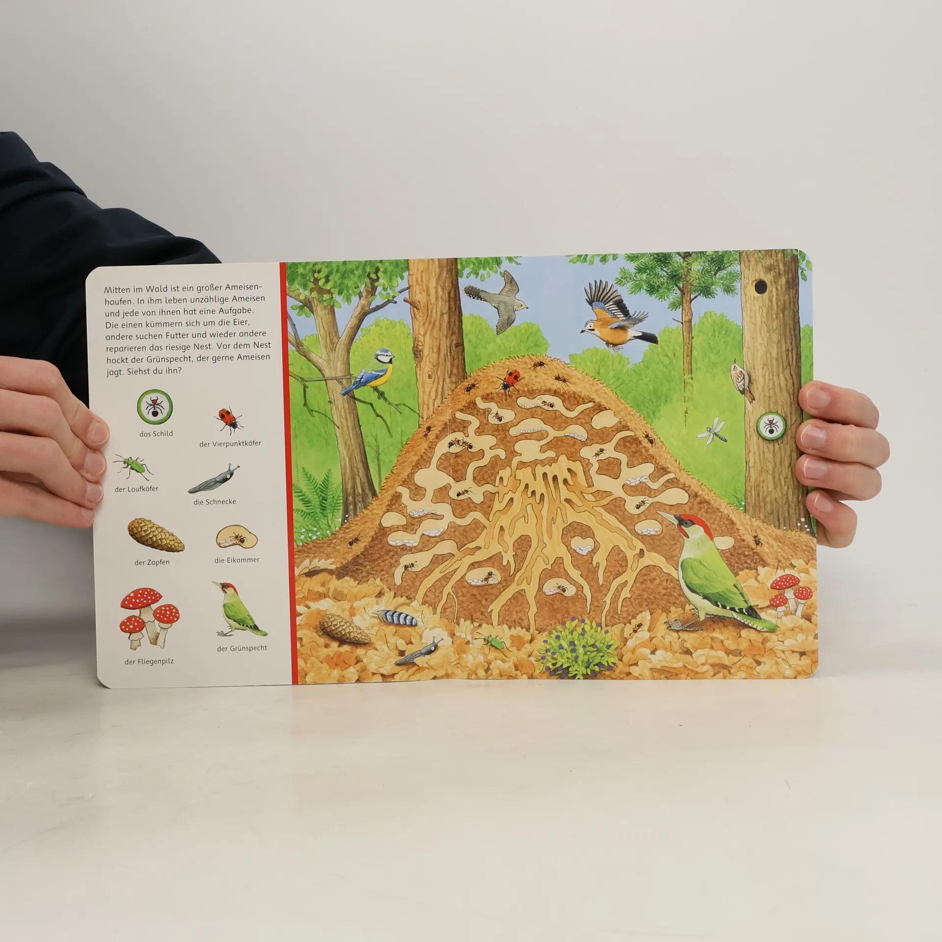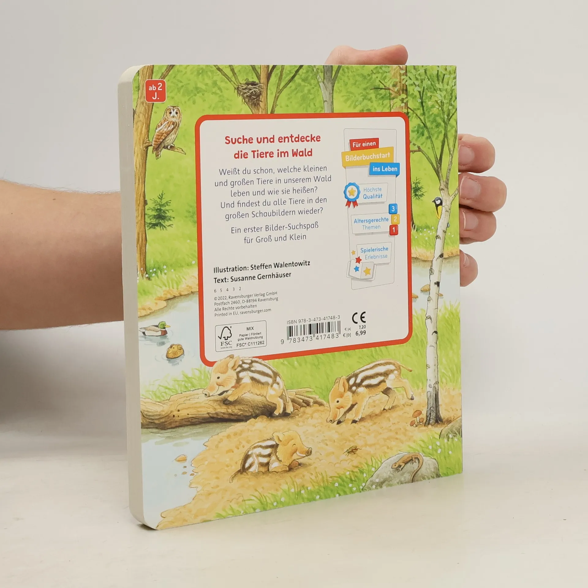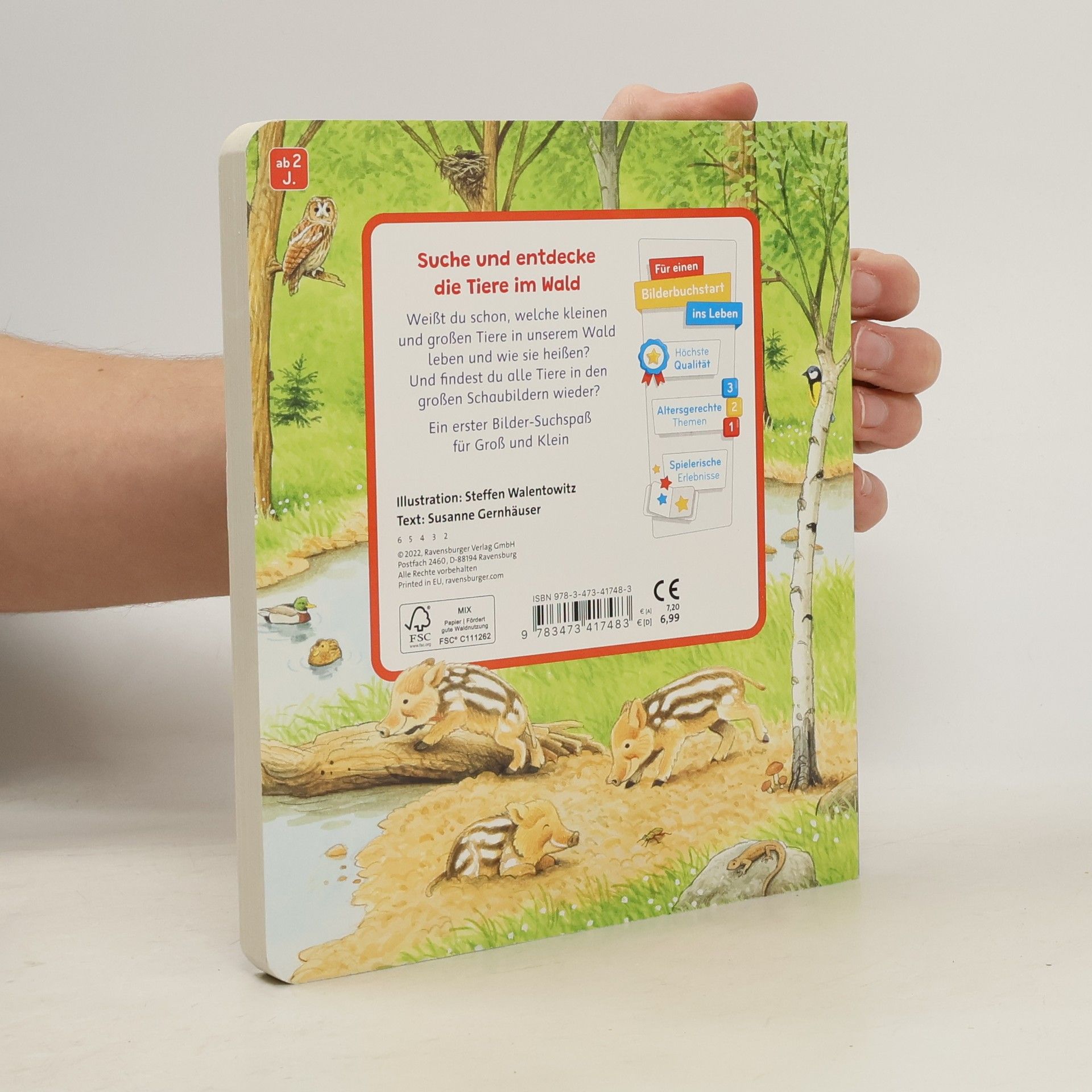 Allererstes Tierbuch liebevoll illustriert Schau mal, wer alles im Wald lebt! Auf elf naturgetreuen Wimmelbildern werden die Tiere und Pflanzen des Waldes lebendig. Wo wohnen die Eichhörnchen und ihre Kinder? Wie sieht ein Ameisenhügel aus? Und wie heißen eigentlich die kleinen Wildschweinkinder? In naturgetreuen Bildern werden die verschiedenen Lebensräume des Waldes und dessen Bewohner gezeigt und die kleinen Suchbilder am Rand der Seiten laden zum Suchen, Finden und Entdecken ein. Weißt du schon, was für spannende Tiere und Pflanzen in unserem Wald leben? Dieses Pappbilderbuch aus der beliebten Reihe "Sachen suchen" vermittelt ganz spielerisch erstes Sachwissen. Zusätzlich fordern die Suchvignetten am Rand dazu auf, ganz genau hinzusehen. In den detailreichen Illustrationen von Steffen Walentowitz wird der spannende Lebensraum Wald in seiner Vielfalt lebendig. Ein Blick in den Ameisenhügel zeigt, dass Ameisenlarven ein eigenes Kinderzimmer haben: die Puppenkammer. Und auch die kleinen Dachsbabys kuscheln sich im Dachsbau unter der Erde aneinander. Wer wohnt denn da dicht bei ihnen? Beim genauen Hinsehen des Waldbodens sieht man, dass auch hier einiges zu entdecken ist. Ein erstes Waldbilderbuch, das dazu einlädt, sich spielerisch in die naturnahen Bilder zu vertiefen und das schon kleinen Kindern den Lebensraum Wald näher bringt.