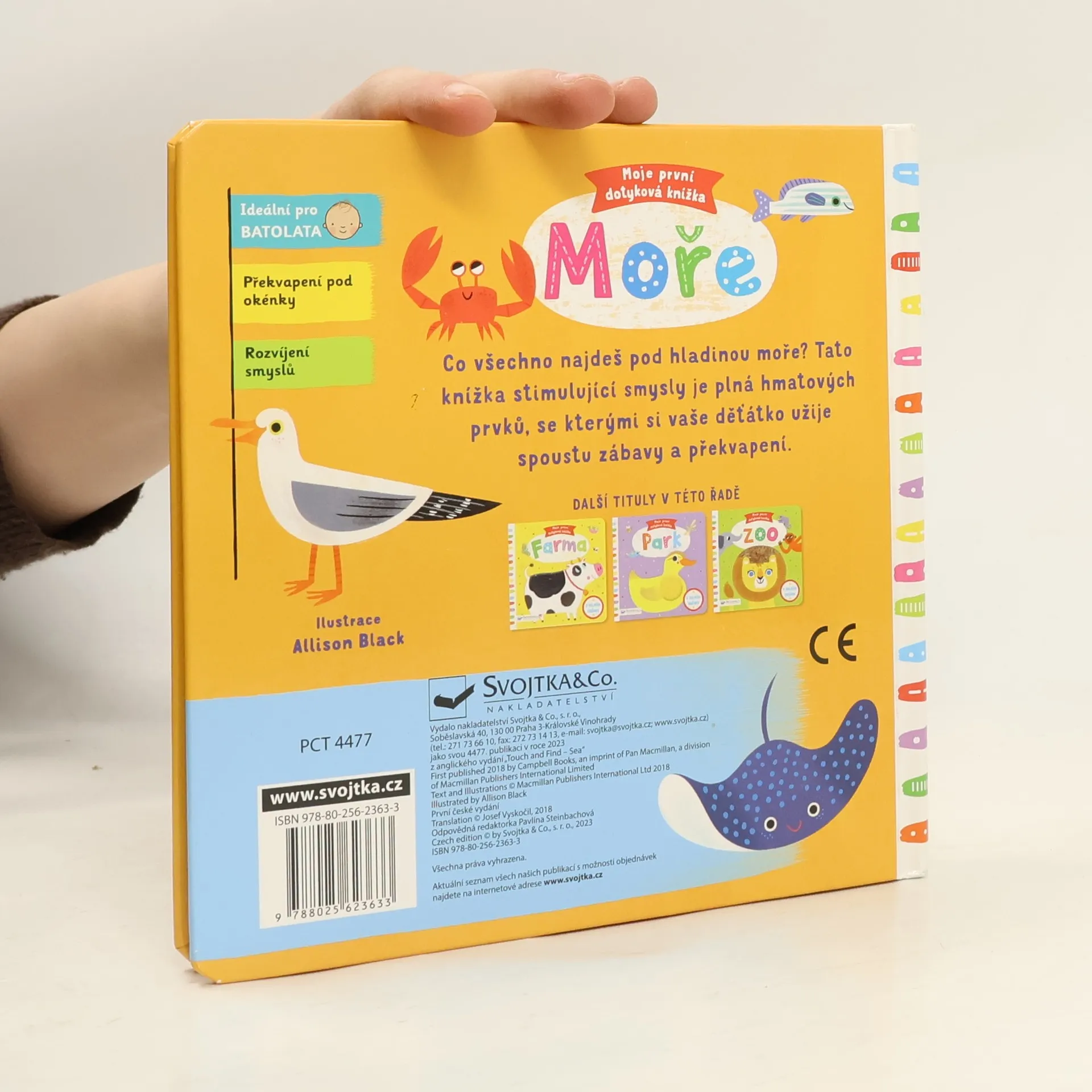 Zjisti, která zvířátka žijí pod hladinou moře, a poznávej je dotykem. Které zvířátko je hladké a které měkoučké? Kdo se skrývá za korály a jakou barvu má mořský koník? Výřezy s hmatovými prvky stimulují a rozvíjejí smysly vašeho dítěte.