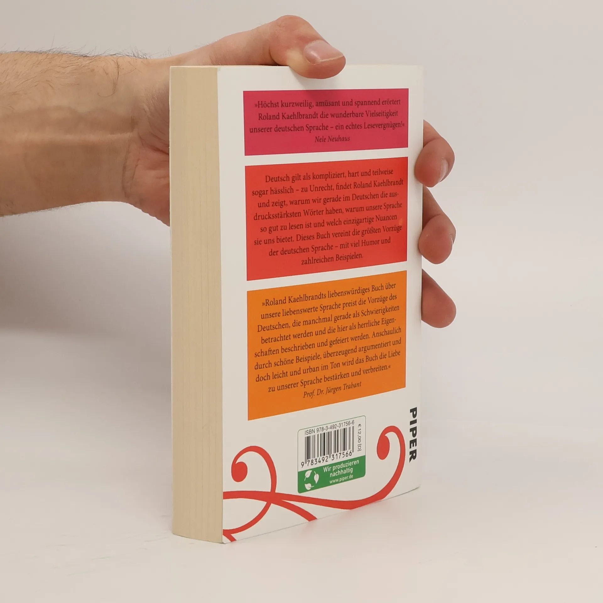 »Eine herrlich unterhaltsame Huldigung.« Deutschlandfunk »Ein ebenso lesenswertes wie gut lesbares Buch.« FAZ »Und so ist die ›Liebeserklärung‹ ein ganz im Geist der Aufklärung geschriebenes Plädoyer für einen toleranten, weltoffenen Kulturpatriotismus. Sie gehört in den Handapparat jedes Deutschlehrers und aller, die an und mit unserer Sprache arbeiten.« Rhein-Zeitung Was die deutsche Sprache kann! Deutsch gilt als kompliziert, hart und teilweise sogar hässlich – zu Unrecht, findet Roland Kaehlbrandt und zeigt, warum wir gerade im Deutschen die ausdrucksstärksten Wörter haben, warum unsere Sprache so gut zu lesen ist und welch einzigartige Nuancen sie uns bietet. Dieses Buch vereint die größten Vorzüge der deutschen Sprache – mit viel Humor und zahlreichen Beispielen. »Höchst kurzweilig, amüsant und spannend erörtert Roland Kaehlbrandt die wunderbare Vielseitigkeit unserer deutschen Sprache – ein echtes Lesevergnügen!« Nele Neuhaus »Roland Kaehlbrandts liebenswürdiges Buch über unsere liebenswerte Sprache preist die Vorzüge des Deutschen, die manchmal gerade als Schwierigkeiten betrachtet werden und die hier als herrliche Eigenschaften beschrieben und gefeiert werden. Anschaulich durch schöne Beispiele, überzeugend argumentiert und doch leicht und urban im Ton wird das Buch die Liebe zu unserer Sprache bestärken und verbreiten.« Prof. Dr. Jürgen Trabant