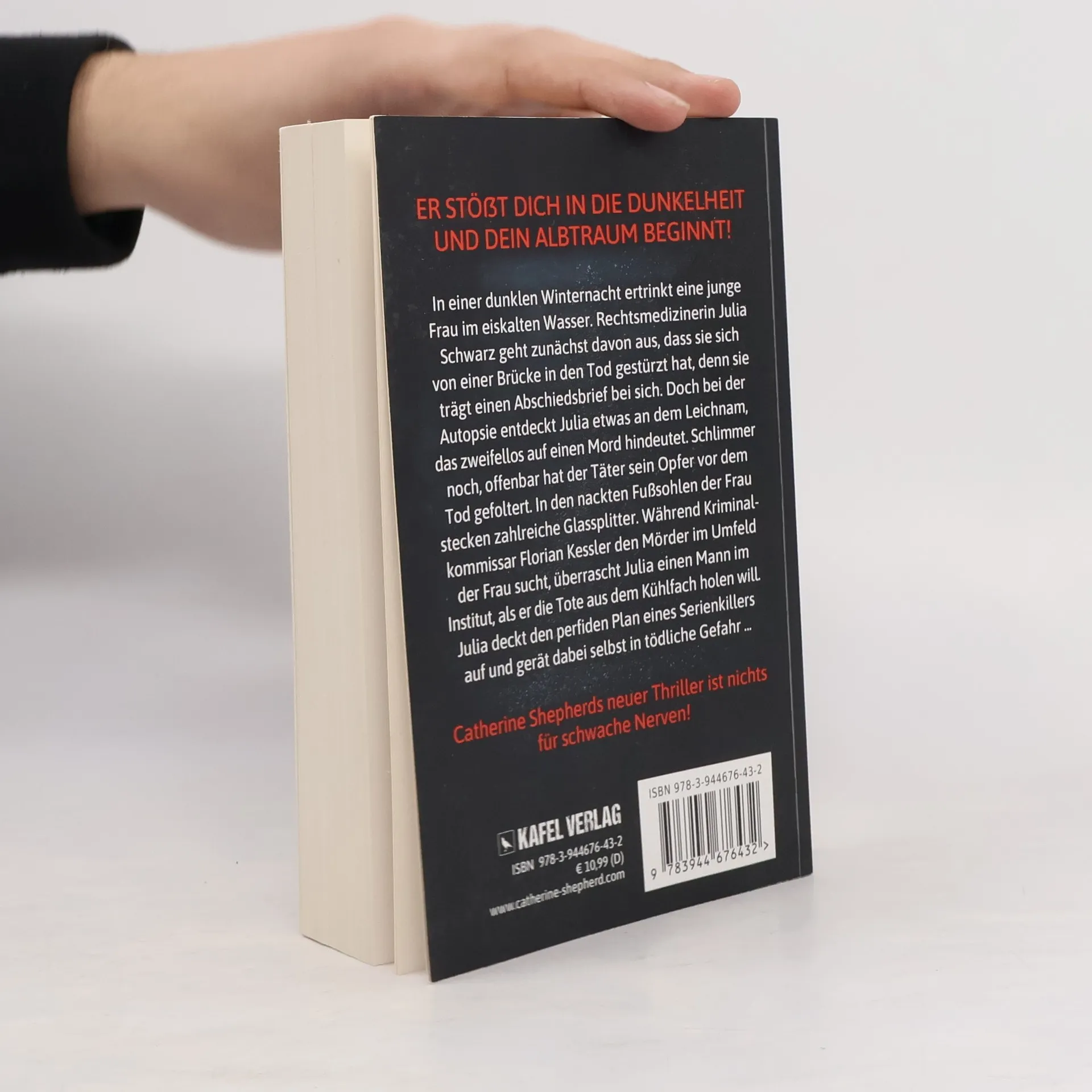 Er stößt dich in die Dunkelheit und dein Albtraum beginnt! In einer dunklen Winternacht ertrinkt eine junge Frau im eiskalten Wasser. Rechtsmedizinerin Julia Schwarz geht zunächst davon aus, dass sie sich von einer Brücke in den Tod gestürzt hat, denn sie trägt einen Abschiedsbrief bei sich. Doch bei der Autopsie entdeckt Julia etwas an dem Leichnam, das zweifellos auf einen Mord hindeutet. Schlimmer noch, offenbar hat der Täter sein Opfer vor dem Tod gefoltert. In den nackten Fußsohlen der Frau stecken zahlreiche Glassplitter. Während Kriminalkommissar Florian Kessler den Mörder im Umfeld der Frau sucht, überrascht Julia einen Mann im Institut, als er die Tote aus dem Kühlfach holen will. Julia deckt den perfiden Plan eines Serienkillers auf und gerät dabei selbst in tödliche Gefahr ...