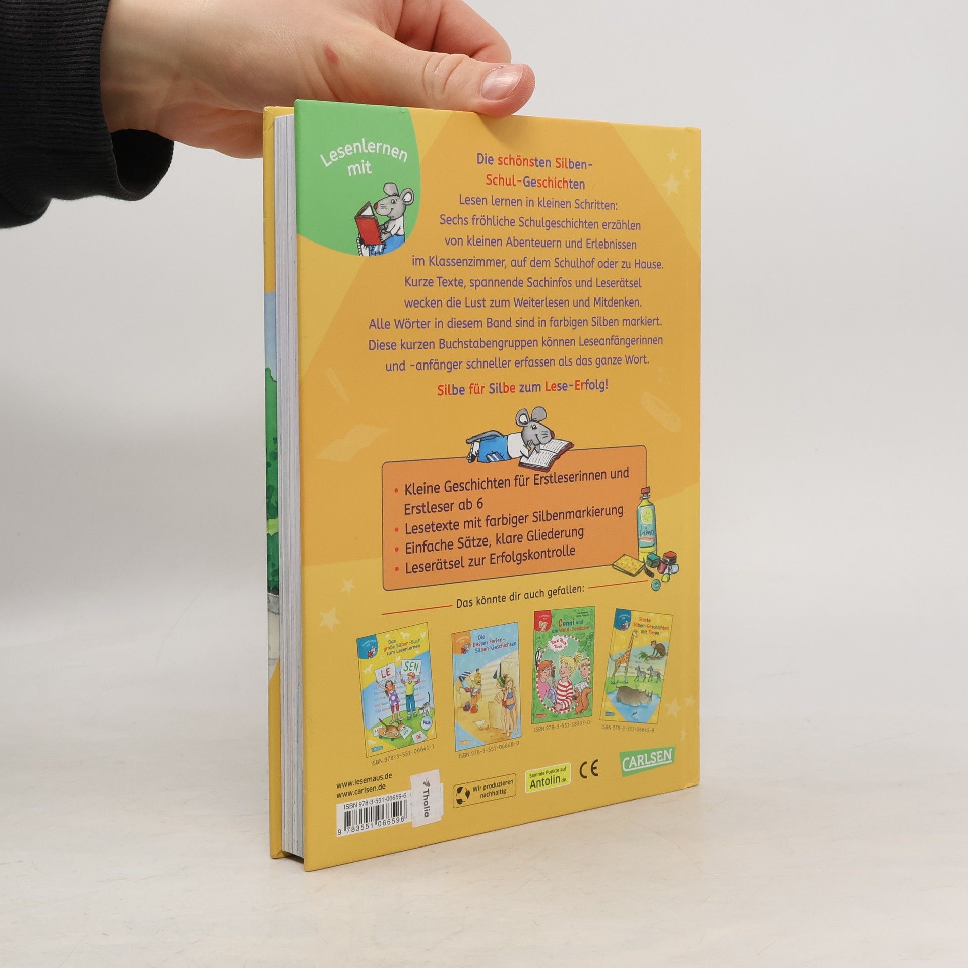 Spannender Lesestoff für Mädchen und Jungen Sechs tolle Schulgeschichten für Leseanfängerinnen und Leseanfänger erzählen von Erlebnissen auf dem Schulhof, im Unterricht und rund um die Schule. Spielerisch lesen lernen mit der Silbenmethode Alle Wörter in diesem Band sind in farbigen Silben markiert. Diese kurzen Buchstabengruppen können Leseanfängerinnen und -anfänger schneller erfassen als das ganze Wort. Kurze Texte, spannende Sachinfos und Leserätsel wecken die Lust zum Weiterlesen und Mitdenken. Der Sammelband enthält folgende Geschichten: Lilli tauscht ihr Pausenbrot Viel Wirbel um den Knopf im Ohr Marie küsst einen Frosch Zoff auf dem Schulhof Fritzi kocht Nudeln Alles, nur nicht Pink! So macht Lesenlernen Spaß! LESEMAUS zum LESENLERNEN – die Reihe für Erstleser! Spannende und leichte Geschichten für Jungs und Mädchen, lustige Leserätsel und kindgerechte Sachinfos motivieren Leseanfänger zum Weiterlesen und Mitdenken.