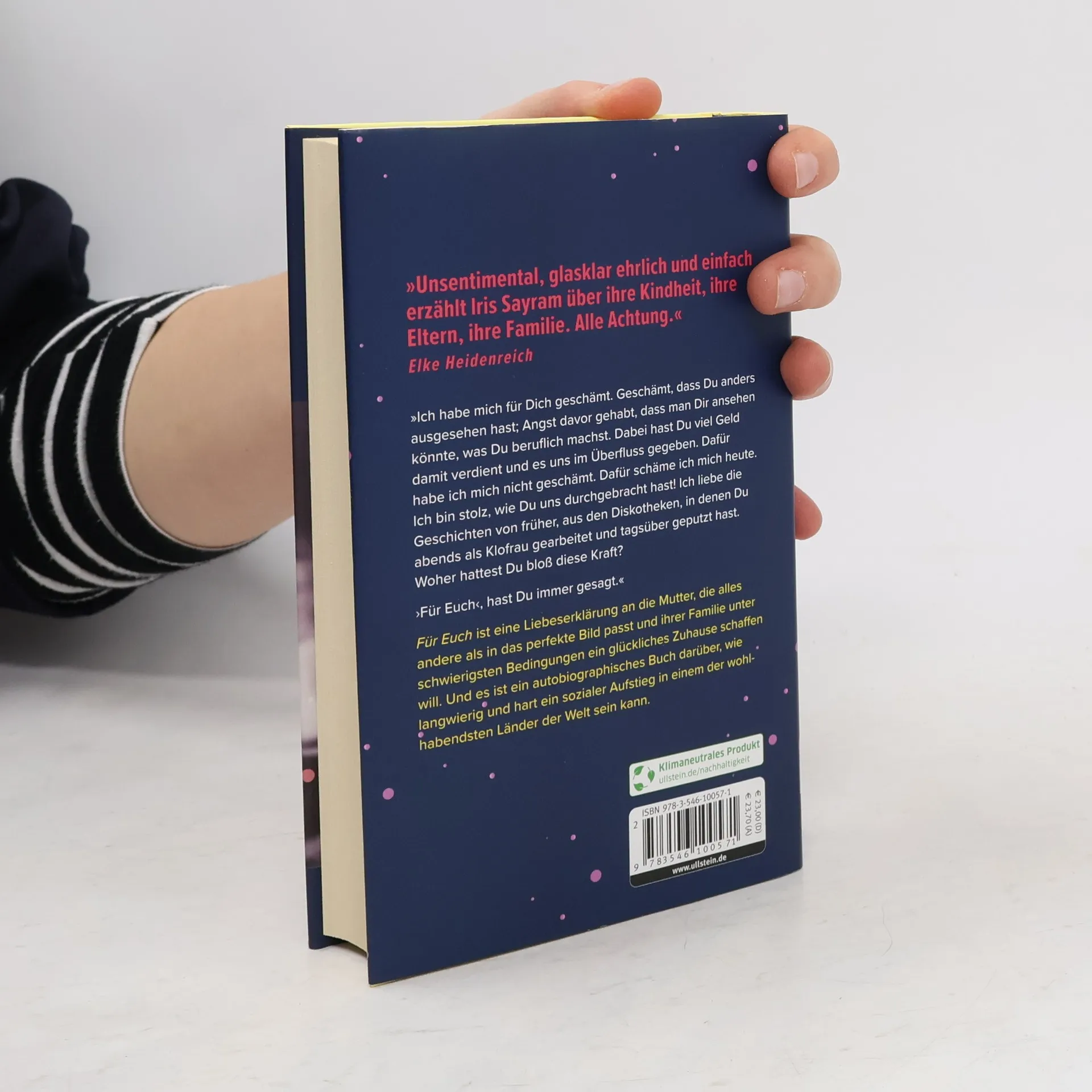 Köln in den 80er und 90er Jahren. Iris' Eltern haben wenig, aber sie haben sich, eine anbetungswürdige kleine Tochter und Lebenslust. Alles andere, was man zum leben braucht, findet sich, irgendwie, solange man einander nur liebt, denken sie. Und Geld verdient man immer, irgendwo, auch wenn es wehtut:"Klofrau war nicht der dreckigste Job, den Du gemacht hast. Jeden Tag. Ob krank oder gesund. Du hattest nichts, schliefst sogar auf der Straße und immer wieder gab es Ärger mit der Polizei. Am Ende konntest Du nur noch das verkaufen, was Dir keiner nehmen kann: Deinen Körper. Viele Narben und Wunden hast Du davongetragen, bist krank geworden. Beklagt hast Du Dich nie. Selbst Deinen Humor hast Du nicht verloren. Wie hast Du das all die Jahre geschafft? „Für Euch“ hast Du immer gesagt. Aber ich habe lange nicht verstanden, wie wörtlich Du das gemeint hast und was Du alles für mich geopfert hast. Bis zu diesem Wochenende.“„Für Euch“ ist eine Liebeserklärung an die Mutter, die alles andere als in das perfekte Bild passt und ihren Kindern unter schwierigsten Bedingungen ein glückliches Zuhause schaffen will. Und es ist ein autobiographischer, so privater wie politischer Essay darüber, wie langwierig und hart ein sozialer Aufstieg in einem der wohlhabendsten Länder der Welt sein kann.