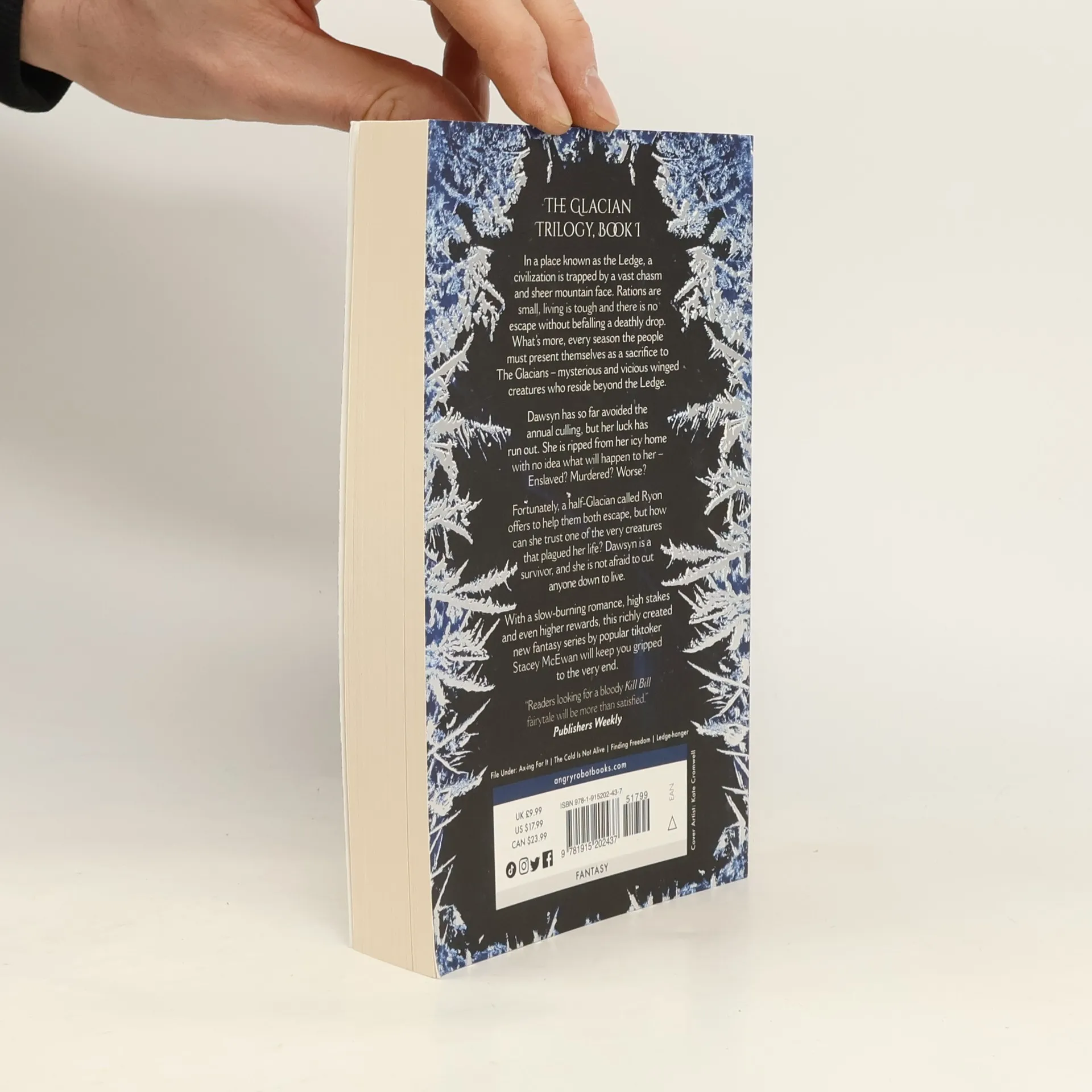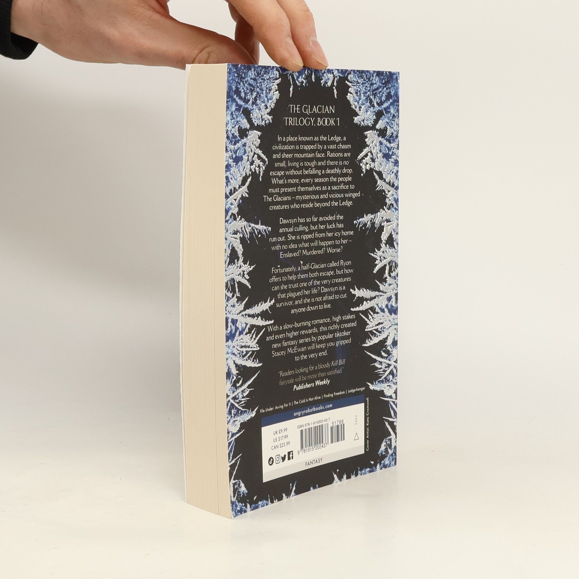 In a place known as the Ledge, a civilization is trapped by a vast chasm and sheer mountain face. There is no way for anyone to escape the frozen wasteland without befalling a deathly drop. They know nothing of the outside world except that it is where the Glacians reside – mystical and vicious winged creatures who bring meagre rations in exchange for a periodic human sacrifice.Dawsyn, ax wielder and only remaining member of her family, has so far avoided the annual culling, but her luck has run out. She is chosen and ripped from her icy home, the only world she knows. No one knows what will happen to her on the other side, least of all Dawsyn. Murdered? Enslaved? Worse?Fortunately, a half-Glacian called Ryon offers to help them both escape, but how can she trust one of the very creatures that plagued her life? Dawsyn is a survivor, and she is not afraid to cut anyone down to live.