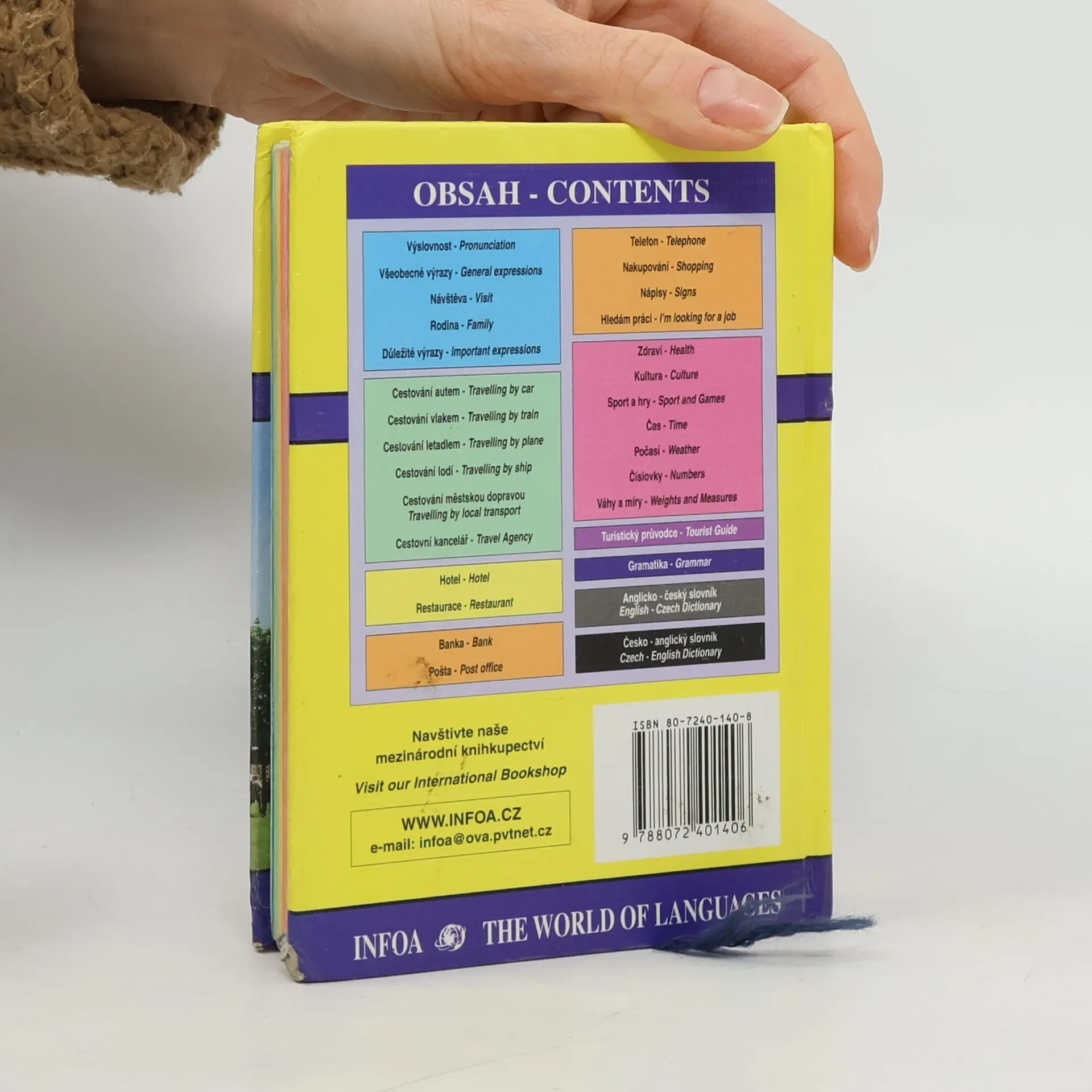 stručný přehled gramatiky, jednoduchý slovníček, základní konverzační témata (rodina, doprava, cestování, hotel, restaurace, pošta, nakupování, kultura, sport a hry, zdraví) a turistický průvodce