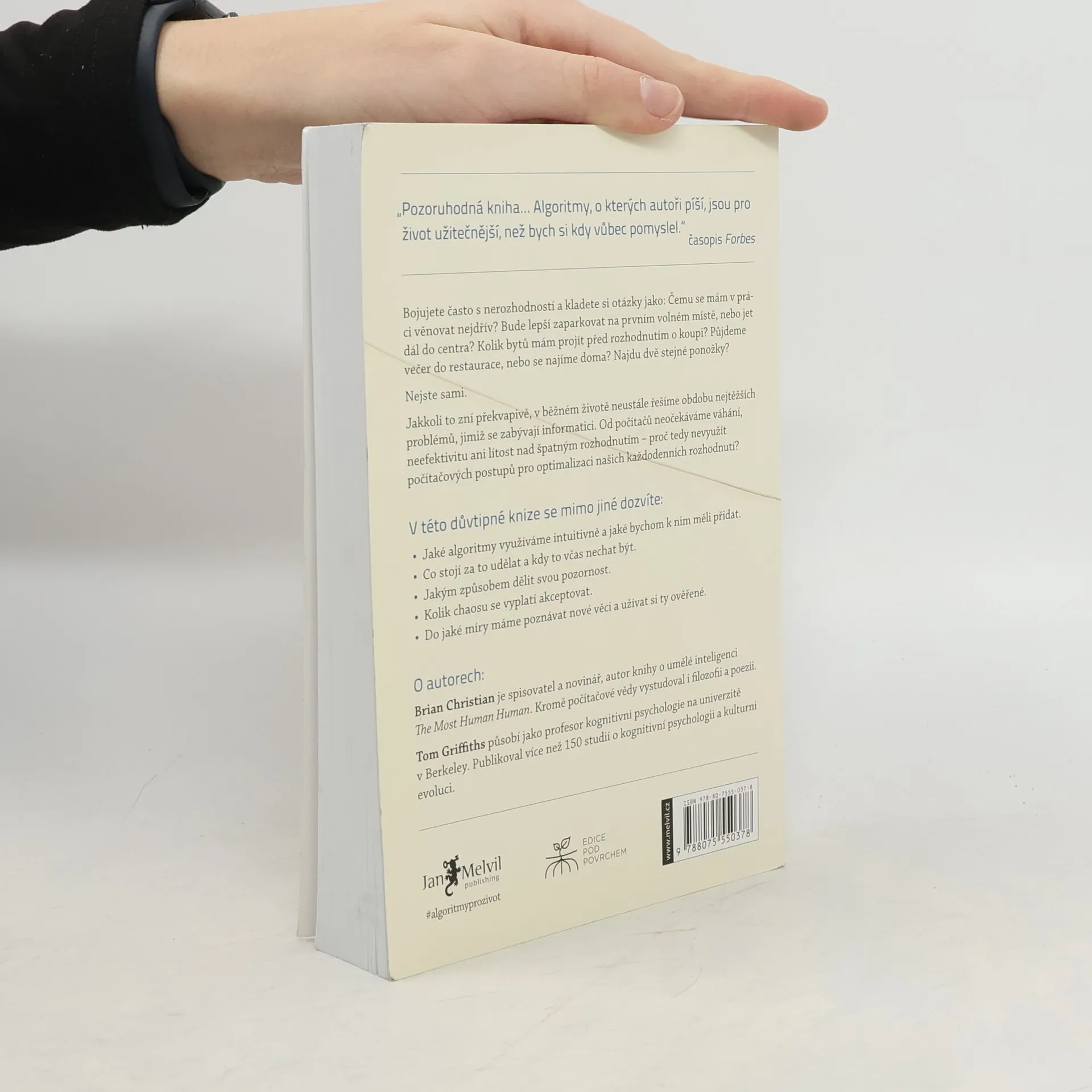 Kniha Algoritmy pro život je strhující pojednání o způsobech využití počítačových algoritmů v každodenním životě. Autoři dokázali proměnit poznatky z oblasti informatiky ve strategie k řešení mnoha problémů v lidském životě — od hledání partnera či partnerky po nalezení parkovacího místa, od řazení obsahu e-mailové schránky po pochopení fungování vlastní paměti. Kniha předkládá řešení rozhodovacích problémů a osvětluje mechanismy lidské mysli. Životy nás všech jsou svázané prostorem a časem, omezeními spjatými s určitou skupinou problémů: Čemu se mám věnovat a na co se naopak vykašlat (dnes, anebo vůbec v životě)? Jak velkou míru chaosu a nepořádku mám ještě přijmout? Jaký poměr mezi novými a oblíbenými činnostmi mě naplňuje nejvíc? Že za vás tato specificky lidská dilemata nemůže vyřešit žádný algoritmus? Omyl! I počítače se potýkají s omezeními a informatici s nimi zápolí již desítky let. Z řešení, která za tu dobu nalezli, se můžeme mnohému přiučit. Uznávaný autor Brian Christian a kognitivní vědec Tom Griffiths v tomto mezioborovém a nečekaném díle ukazují, jak počítačem využívané algoritmy dokážou rozetnout i velice lidské otázky. Vysvětlují, jak zlepšit vlastní intuici a kdy je lepší vše ponechat náhodě, jak se vypořádat s přehršlem možností volby a jak se nejlépe spojit s ostatními.