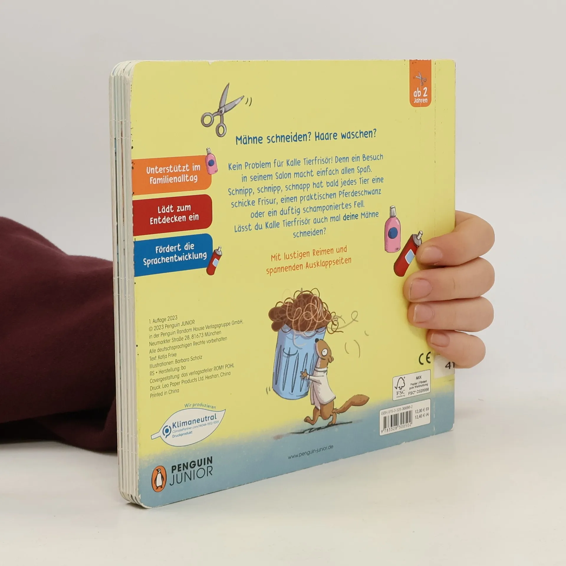 So viel Spaß beim Haareschneiden! Ein lustiges Pappbilderbuch mit Ausklappseiten Mähne schneiden? Haare waschen? Kein Problem für Kalle Tierfrisör! Denn ein Besuch in seinem Salon ist einfach toll. Schnipp, schnipp, schnapp hat bald jedes Tier eine schicke Frisur, einen praktischen Pferdeschwanz oder ein duftig schamponiertes Fell. Lustige Reime und witzige Ausklappseiten machen schon den Kleinen großen Spaß und lassen das Haareschneiden zu einem Erlebnis werden. Ein großartiges Pappbilderbuch zum Mitmachen und Lachen für Kinder ab 2 Jahren - Unterstützt im Familienalltag - Lädt zum Mitmachen ein - Fördert die Sprachentwicklung Ausstattung: Mit fbg. Illustrationen und 6 Ausklappseiten