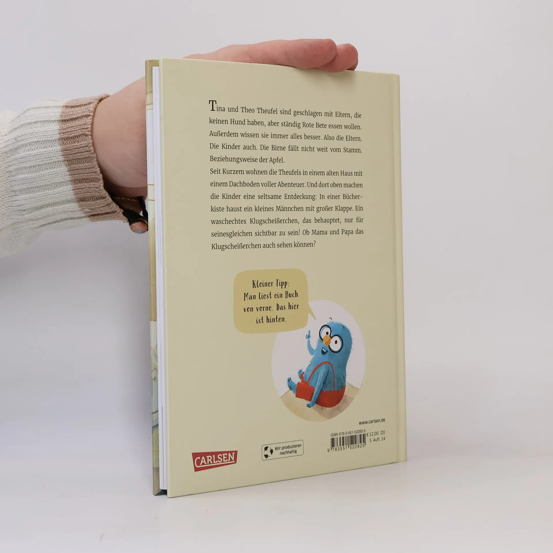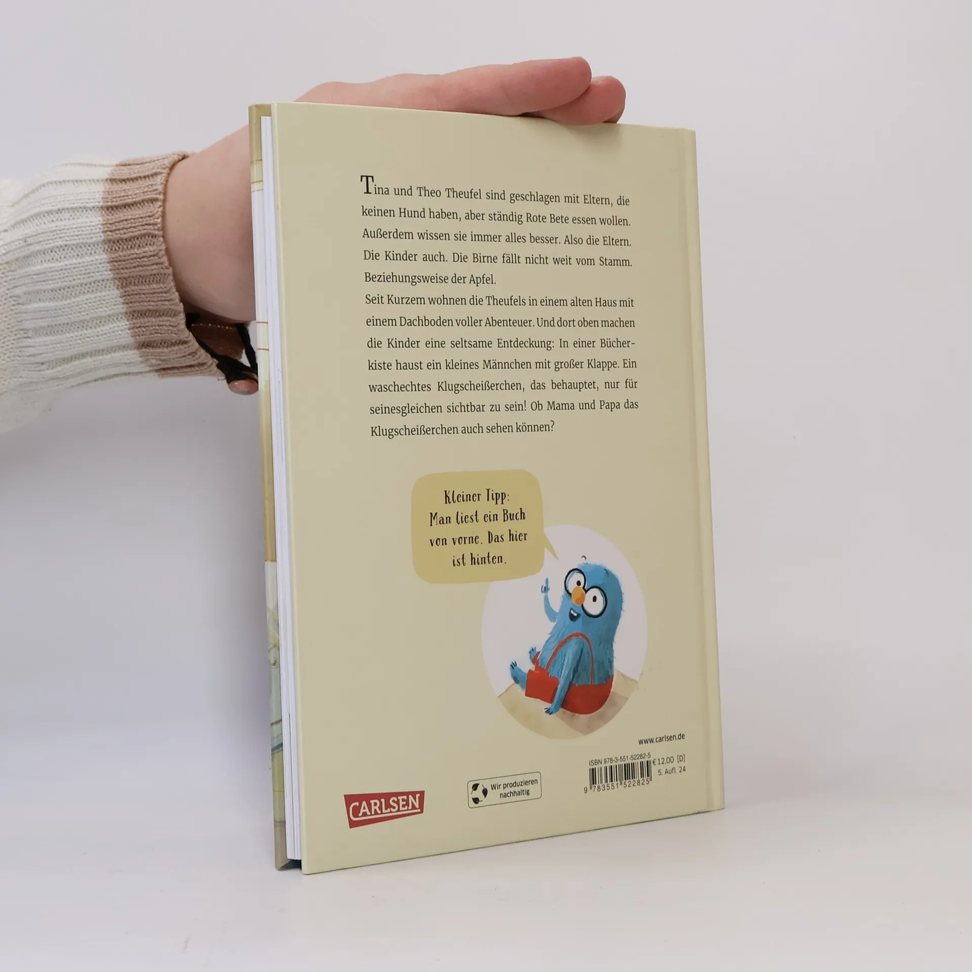 "Tina und Theo Theufel sind geschlagen mit Eltern, die keinen Hund haben, aber ständig Rote Beete essen wollen. Außerdem wissen sie immer alles besser. Also die Eltern. Die Kinder auch. Die Birne fällt nicht weit vom Stamm. Beziehungsweise der Apfel. Seit Kurzem wohnen die Theufels in einem alten Haus mit einem Dachboden voller Abenteuer. Und dort oben machen die Kinder auf dem Dachboden eine seltsame Entdeckung: In einer Bücherkiste haust ein kleines Männchen mit großer Klappe. Ein waschechtes Klugscheißerchen, das behauptet, nur für seinesgleichen sichtbar zu sein! Ob Mama und Papa das Klugscheisserchen auch sehen können?"--Publisher's website.