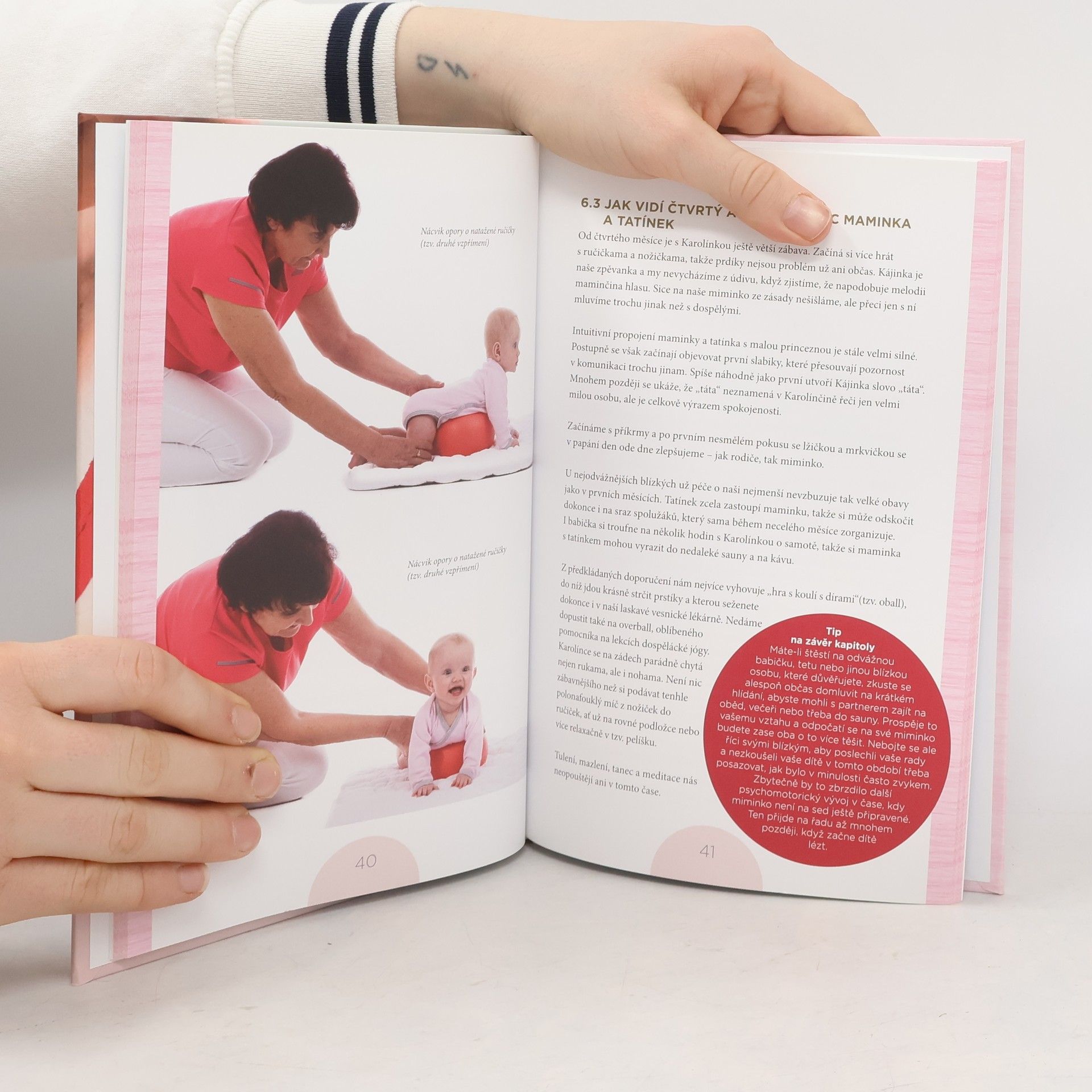 Rady pro rodiče, jak dobře zvládnout pohybový vývoj dítěte od narození do jednoho roku Odložte na chvíli knihu a podívejte se na své ruce. Něžně, klidně a pevně obejměte své miminko. Nikdo vaše dlaně umění dotyku neučil, přesto přesně ví, co mají dělat. Nejlepší knihou o vašem miminku je a vždy bude vaše miminko samo. Žádná sebelepší publikace nemůže nahradit signály, které vám vaše děťátko od narození vysílá. Naslouchejte mu a naučte se jeho signály správně číst. Váš úkol je jediný - milovat své dítě a vytvářet takové prostředí, které mu pomůže v jeho přirozeném vývoji, nikoliv naopak. Tato kniha si klade za cíl inspirovat vás k tomu, abyste si se svým děťátkem v jednotlivých fázích vývoje přirozeně hráli. Každé dítě je od narození osobnost, a proto nemůžeme očekávat, že se všechny děti budou v daném období pohybovat stejně. Nejdůležitější ale je žádnou fázi vývoje nepřeskočit.
