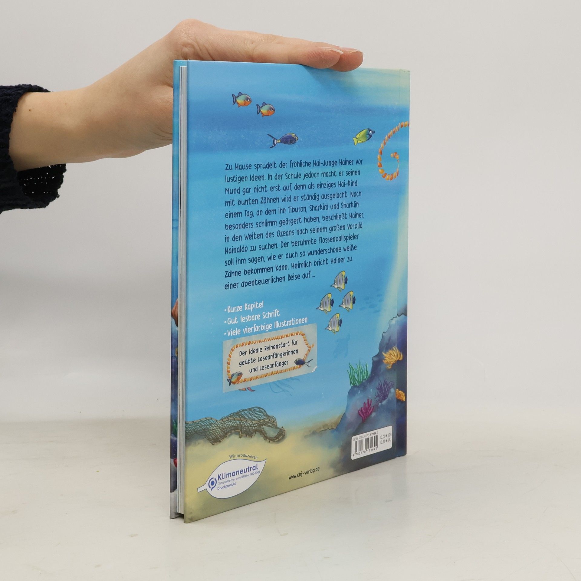 Ein kleiner Hai mit großen Fragen Rot, gelb, blau und grün — so leuchten die Zähne von Hainer jedem entgegen. Aber wegen dieser bunten Zähne wird der kleine Hai von seinen Mitschülern Sharklyn, Tiburon und Sharkira ausgelacht, denn solche Zähne hat in Haimhausen niemand. Hainer beschließt, seiner Heimat den Rücken zu kehren und sein großes Vorbild Hainaldo um Rat zu fragen. Die Zähne des berühmten Flossenballspielers sind blendend weiß, perfekt spitz und wachsen nach jeder Heldentat größer nach. Hainer begibt sich auf eine abenteuerliche Reise, auf der er nicht nur das Geheimnis seiner bunten Zähne lüftet und wahre Freunde findet, sondern auch lernt, was im Leben wirklich wichtig ist. Die neue Reihe mit Hainer, dem kleinen Hai: kurze Kapitel, viele bunte Illustrationen und gut lesbare Druckschrift sind ideal für geübte Leseanfängerinnen und Leseanfänger. Ausstattung: Mit fbg. Illustrationen