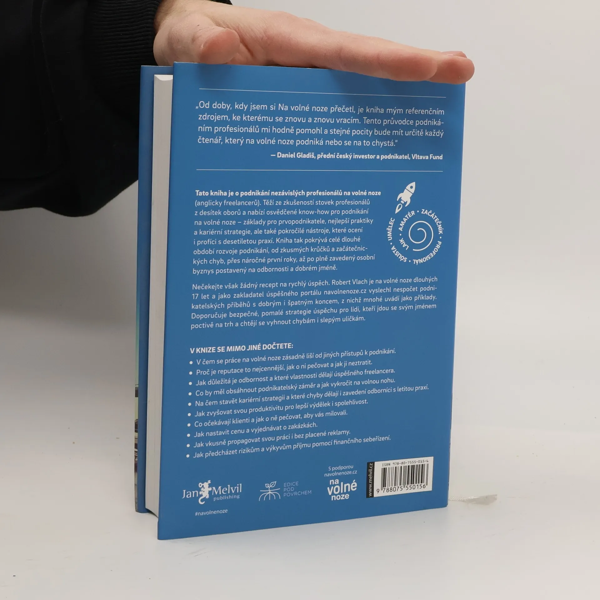 První kniha v češtině o podnikání nezávislých profesionálů těží ze zkušeností mnoha set českých freelancerů z desítek oborů. Nabízí osvědčené postupy a know-how pro podnikání na volné noze: základy pro prvopodnikatele, nejlepší praktiky a kariérní strategie, ale také pokročilé nástroje, které ocení i profíci s více než desetiletou podnikatelskou praxí. Kniha tak pokrývá celé dlouhé období rozvoje podnikání, od zkusmých krůčků a začátečnických chyb, přes náročné první roky, až po plně zavedený osobní byznys postavený na odbornosti a dobrém jméně (s překvapivou pointou na závěr).