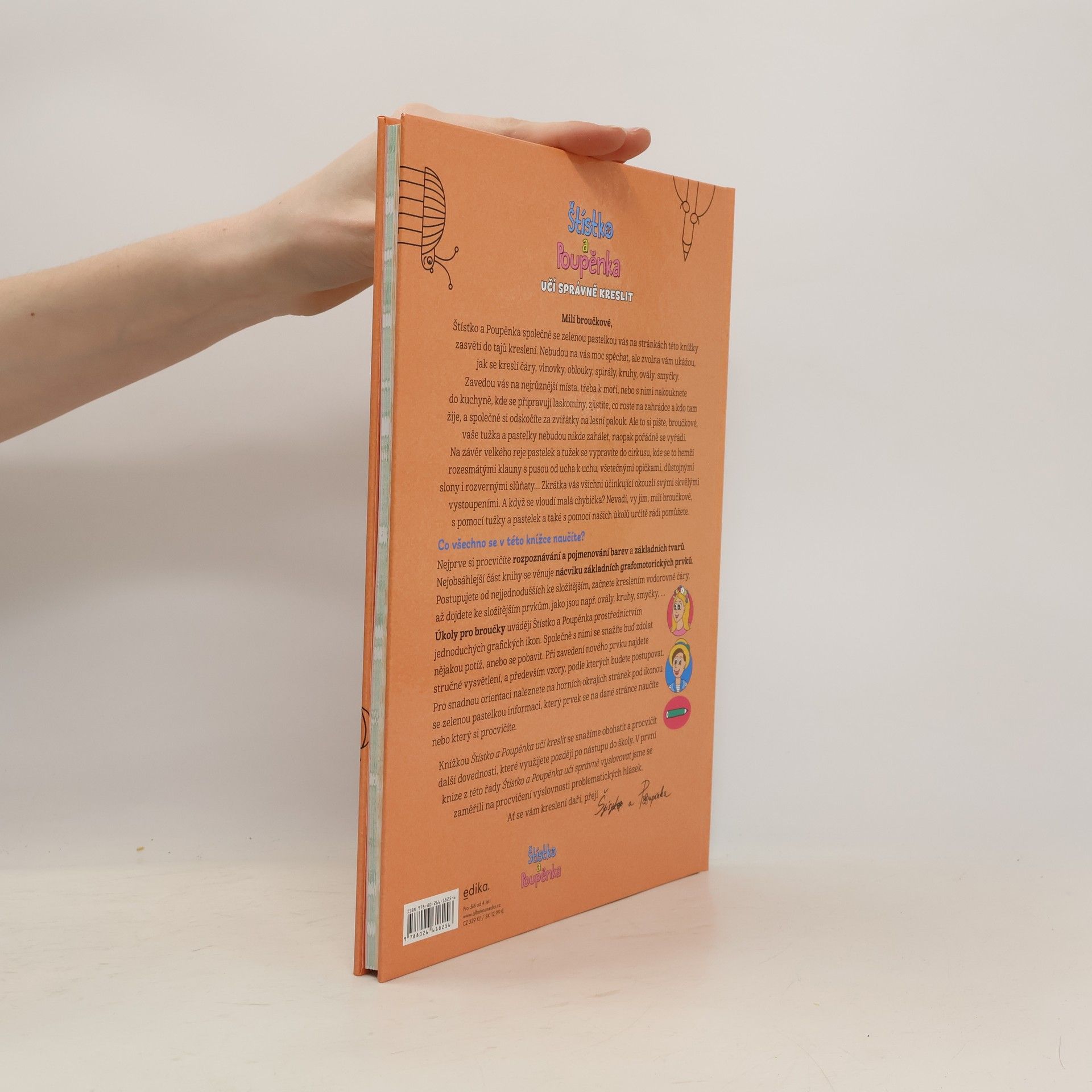 Může být procvičování základních grafomotorických prvků zábava? Štístko a Poupěnka s pomocí zelené pastelky předškolákům a mladším školákům dokážou, že ano. Proč? Protože si sami mohou knížku dotvořit. Zelená pastelka je zasvětí do tajů kreslení a postupně jim ukáže, jak si poradit s čarami, vlnovkami, oblouky, spirálami, kruhy, ovály, smyčkami, … Od lehčích úkolů plynule přejdou k náročnějším – a přitom je s oblíbenou dvojicí čeká spousta legrace!