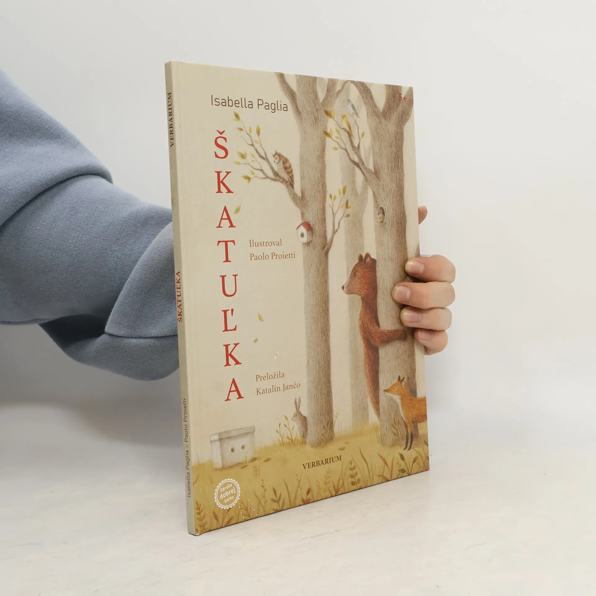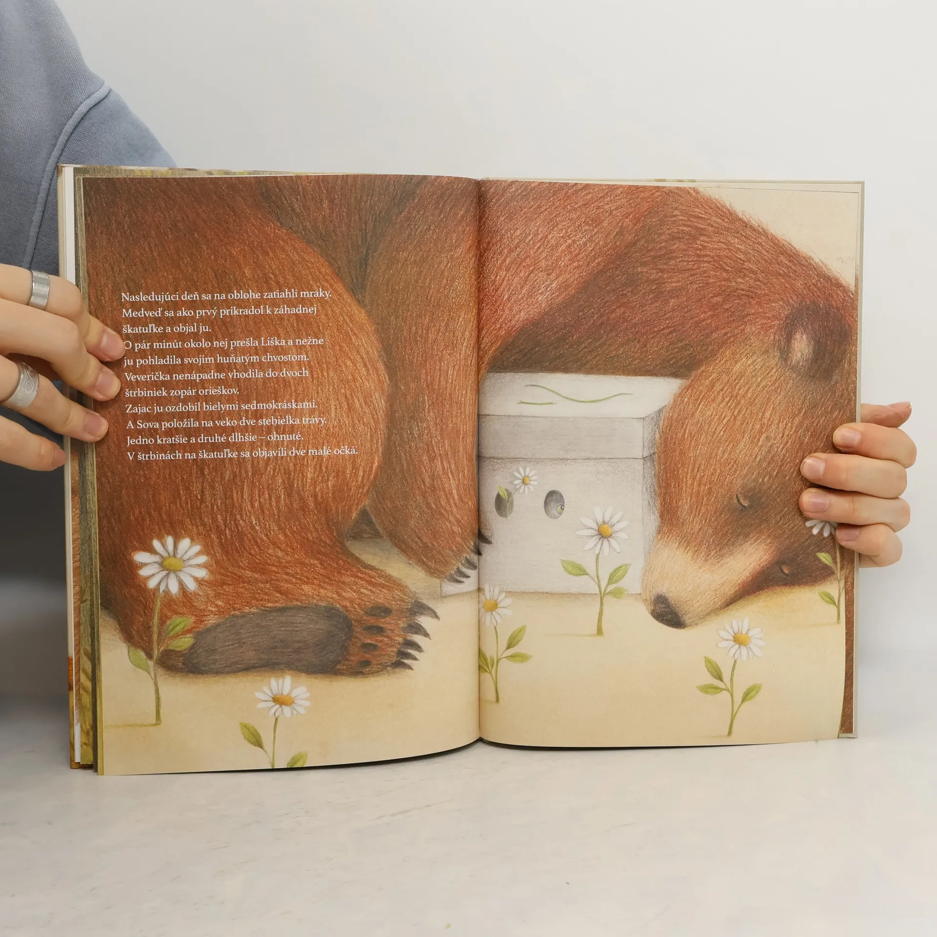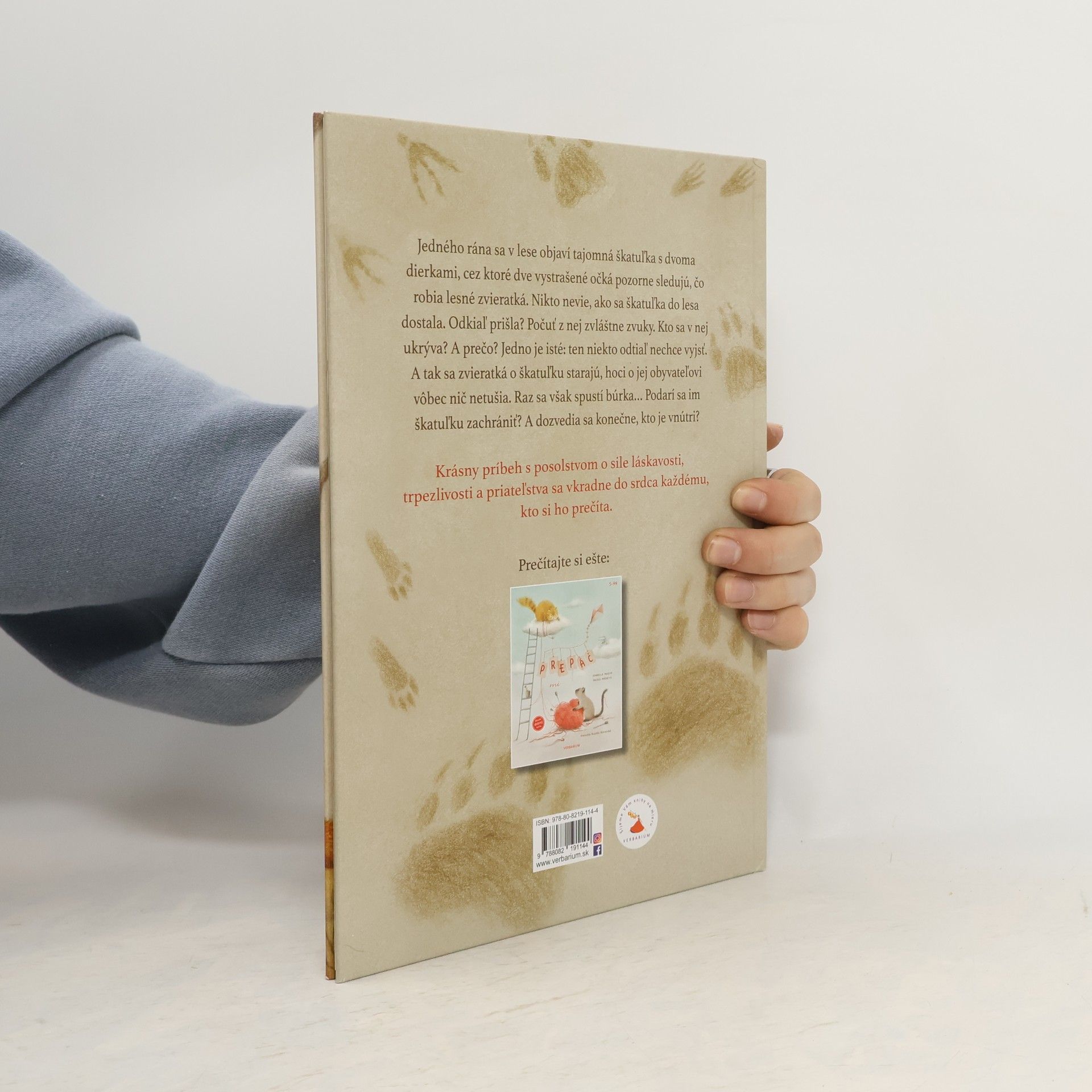 Jedného rána sa v lese objaví tajomná škatuľka s dvoma dierkami, cez ktoré dve vystrašené očká pozorne sledujú, čo robia lesné zvieratká. Nikto nevie, ako sa škatuľka do lesa dostala. Odkiaľ prišla? Počuť z nej zvláštne zvuky. Kto sa v nej ukrýva? A prečo? Jedno je isté: ten niekto odtiaľ nechce vyjsť. A tak sa zvieratká o škatuľku starajú, hoci o jej obyvateľovi vôbec nič netušia. Raz sa však spustí búrka… Podarí sa im škatuľku zachrániť? A dozvedia sa konečne, kto je vnútri? Krásny príbeh s posolstvom o sile láskavosti, trpezlivosti a priateľstva sa vkradne do srdca každému, kto si ho prečíta.