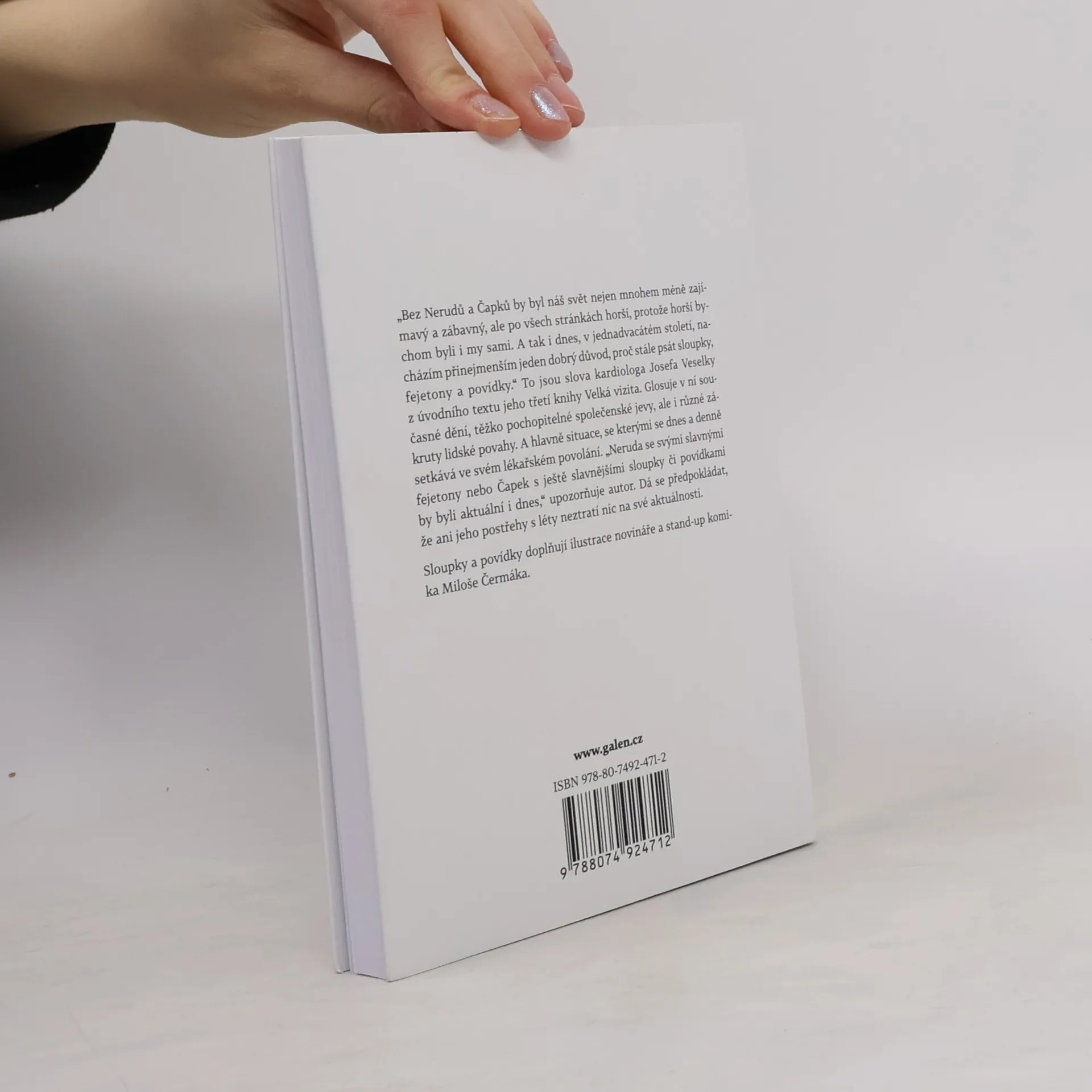 „Bez Nerudů a Čapků by byl náš svět nejen mnohem méně zajímavý a zábavný, ale po všech stránkách horší, protože horší bychom byli i my sami. A tak i dnes, v jednadvacátém století, nacházím přinejmenším jeden dobrý důvod, proč stále psát sloupky, fejetony a povídky.“ To jsou slova kardiologa Josefa Veselky z úvodního textu jeho třetí knihy Velká vizita. Glosuje v ní současné dění, těžko pochopitelné společenské jevy, ale i různé zákruty lidské povahy. A hlavně situace, se kterými se dnes a denně setkává ve svém lékařském povolání. „Neruda se svými slavnými fejetony nebo Čapek s ještě slavnějšími sloupky či povídkami by byli aktuální i dnes,“ upozorňuje autor. Dá se předpokládat, že ani jeho postřehy s léty neztratí nic na své aktuálnosti. Sloupky a povídky doplňují ilustrace novináře a stand-up komika Miloše Čermáka.