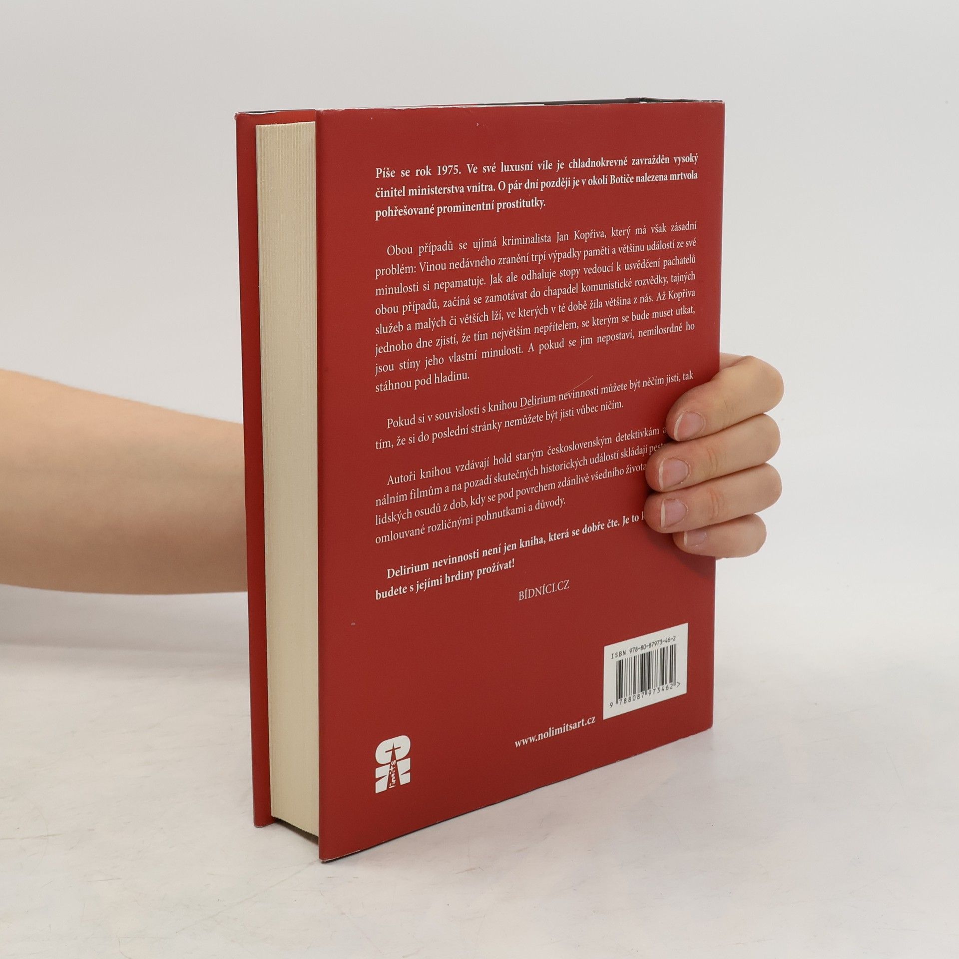 Píše se rok 1975. Ve své luxusní vile je chladnokrevně zavražděn vysoký činitel ministerstva vnitra. O pár dní později je v okolí Botiče nalezena mrtvola pohřešované prominentní prostitutky. Obou případů se ujímá kriminalista Jan Kopřiva, který má však zásadní problém: Vinou nedávného zranění trpí výpadky paměti a většinu událostí ze své minulosti si nepamatuje. Jak ale nachází stopy vedoucí k odhalení pachatelů obou případů, začíná se zamotávat do chapadel komunistické rozvědky, tajných služeb a malých či větších lží, ve kterých v té době žila většina z nás. Až Kopřiva jednoho dne zjistí, že tím největším nepřítelem, se kterým se bude muset utkat, jsou stíny jeho vlastní minulosti. A pokud se jim nepostaví, nemilosrdně ho stáhnou pod hladinu. Pokud si v souvislosti s knihou Delirium nevinnosti můžete být něčím jisti, tak tím, že si do poslední stránky nemůžete být jisti vůbec ničím. Autoři knihou vzdávají hold starým československým detektivkám a kriminálním filmům a na pozadí skutečných historických událostí skládají pestrý obraz lidských osudů z dob, kdy se pod povrchem zdánlivě všedního života ukrývalo zlo omlouvané rozličnými pohnutkami a důvody. Delirium nevinnosti není jen kniha, která se dobře čte. Je to kniha, kterou budete s jejími hrdiny prožívat!