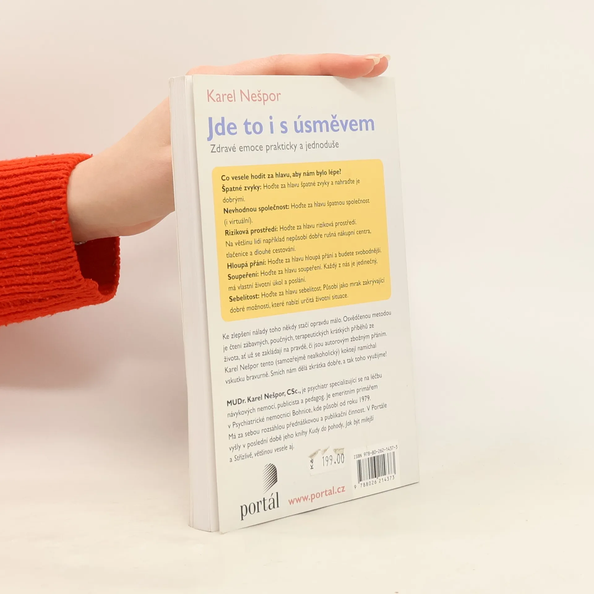 Špatné zvyky: Hoďte za hlavu špatné zvyky a nahraďte je dobrými. Nevhodnou společnost: Hoďte za hlavu špatnou společnost (i virtuální). Riziková prostředí: Hoďte za hlavu riziková prostředí. Na většinu lidí například nepůsobí dobře rušná nákupní centra, tlačenice a dlouhé cestování. Hloupá přání: Hoďte za hlavu hloupá přání a budete svobodnější. Soupeření: Hoďte za hlavu soupeření. Každý z nás je jedinečný, má vlastní životní úkol a poslání. Sebelítost: Hoďte za hlavu sebelítost. Působí jako mrak zakrývající dobré možnosti, které nabízí určitá životní situace. Ke zlepšení nálady toho někdy opravdu stačí málo. Osvědčenou metodou je čtení zábavných, poučných, terapeutických krátkých příběhů ze života, ať už se zakládají na pravdě či jsou autorovým zbožným přáním. Karel Nešpor tento (samozřejmě nealkoholický!) koktejl namíchal vskutku bravurně. Smích nám dělá zkrátka dobře, a tak toho využijeme. Kniha je doplněna užitečnou kapitolkou Jednoduché postupy, návody a techniky. MUDr. Karel Nešpor, CSc., je český psychiatr specializovaný na léčbu návykových nemocí, publicista a pedagog. V Portále vyšla řada jeho úspěšných knih, mj. Kudy do pohody, Jak být milejší nebo Střízlivě, většinou vesele.