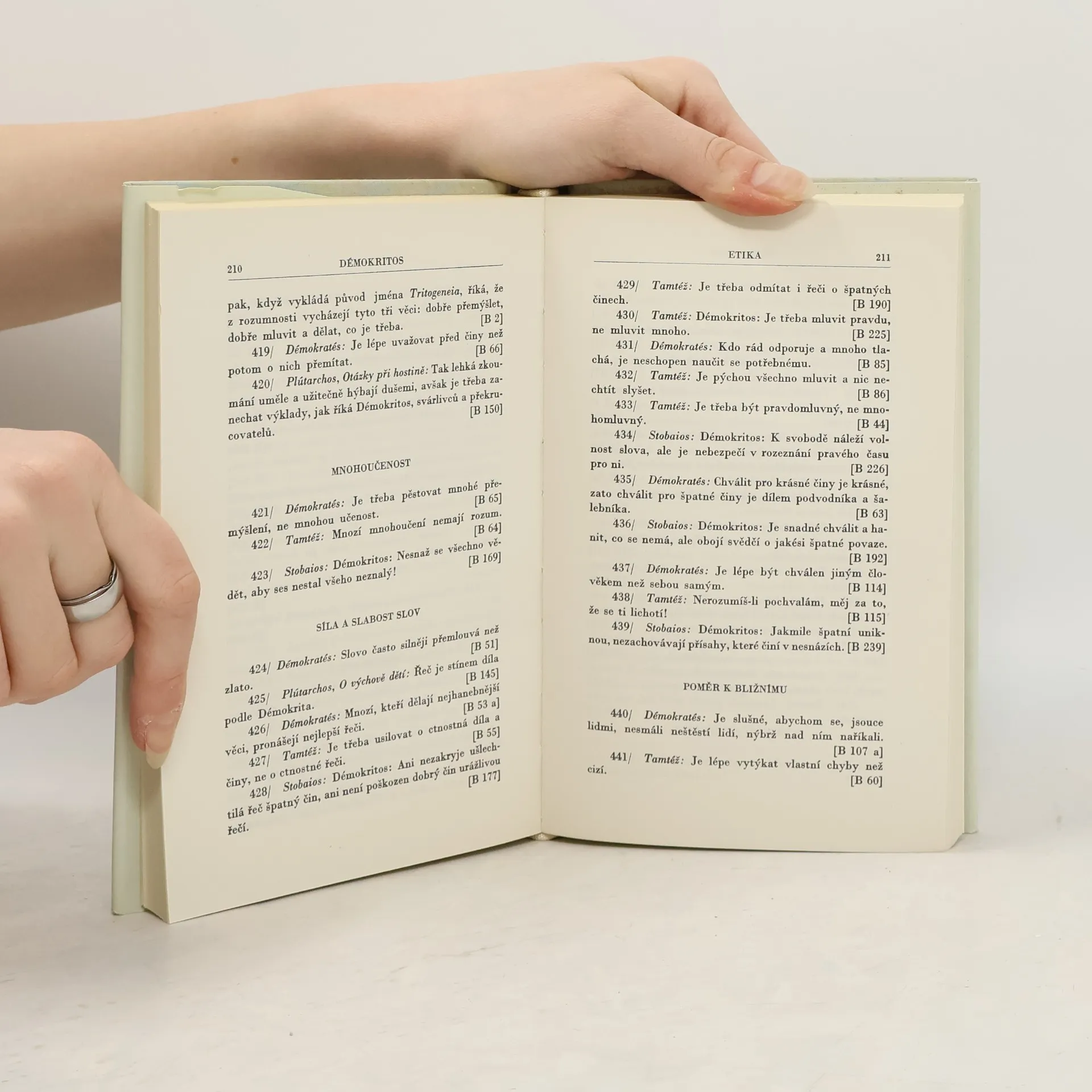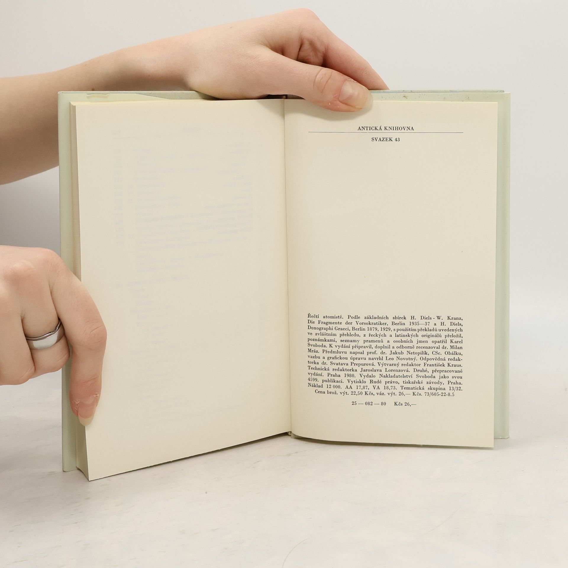 Výbor dochovaných zlomkovitých zpráv o životních osudech a učení starořeckých atomistů. Leukippos, Démokritos, Leukippova škola. Dochované zprávy o životě a učení starořeckých atomistů seznamují čtenáře s mnoha zajímavými stránkami antického myšlení. Netýkají se jen vlastníhojádra atomistické filozofie, která patřila k nejvýraznějším směrům antiky a svým odkazem později výrazně přispěla k formování novověké vědy. V 5. a 4. století př. n. l., kdy působili staří atomisté, Řekové ještě zahrnovali do pojmu „filozofie“ veškerou badatelskou a myslitelskou činnost a k částečné diferenciaci docházelo jen u několika málo vědních oborů. Zprávy o starořeckých atomistech nás proto poučují i o prvních poznatcích, k nimž došlo řecké myšlení v oblasti biologie, fyziky, matematiky, jazykovědy, politiky a samozřejmě i etiky. Současně nám přibližují i osudy mnohých břitkých a originálních myslitelů, kteří často velmi statečně tepali nedostatky a zlořády své doby. Jsou pramenem, z něhož se dovídáme mnoho jinak nedostupných údajů nejen o antické vědě, ale i o životě v tehdejším Řecku.