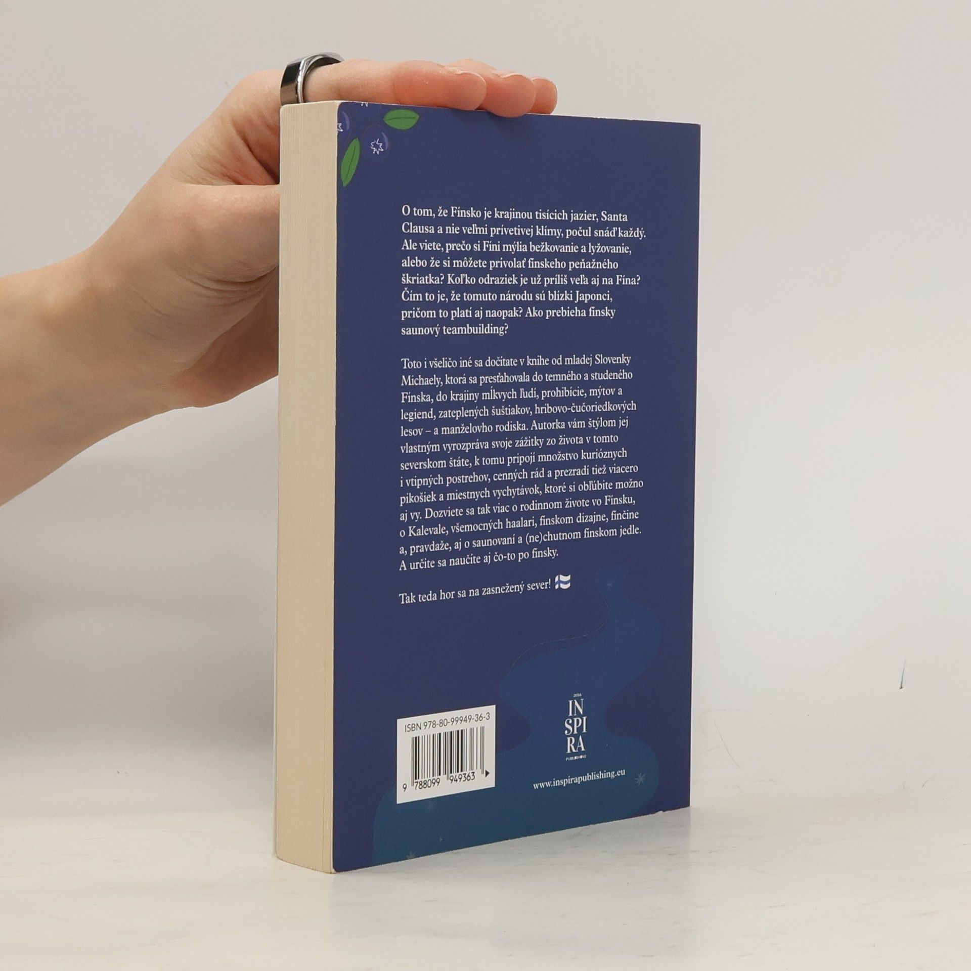 O tom, že Fínsko je krajinou tisícich jazier, Santa Clausa a nie veľmi prívetivej klímy, počul snáď každý. Ale viete, prečo si Fíni mýlia bežkovanie a lyžovanie, alebo že si môžete privolať fínskeho peňažného škriatka? Koľko odraziek je už príliš veľa aj na Fína? Čím to je, že tomuto národu sú blízki Japonci, pričom to platí aj naopak? Ako prebieha fínsky saunový teambuilding? Toto i všeličo iné sa dočítate v knihe od mladej Slovenky Michaely, ktorá sa presťa-hovala do temného a studeného Fínska, do krajiny mĺkvych ľudí, prohibície, mýtov a legiend, zateplených šuštiakov, hríbovo-čučoriedkových lesov – a manželovho ro-diska. Autorka vám štýlom jej vlastným vyrozpráva svoje zážitky zo života v tomto severskom štáte, k tomu pripojí množstvo kurióznych i vtipných postrehov, cenných rád a prezradí tiež viacero pikošiek a miestnych vychytávok, ktoré si obľúbite možno aj vy. Dozviete sa tak viac o rodinnom živote vo Fínsku, o Kalevale, všemocných haalari, fínskom dizajne, fínčine a, pravdaže, aj o saunovaní a (ne)chutnom fínskom jedle. A určite sa naučíte aj čo-to po fínsky. Tak teda hor sa na zasnežený sever!