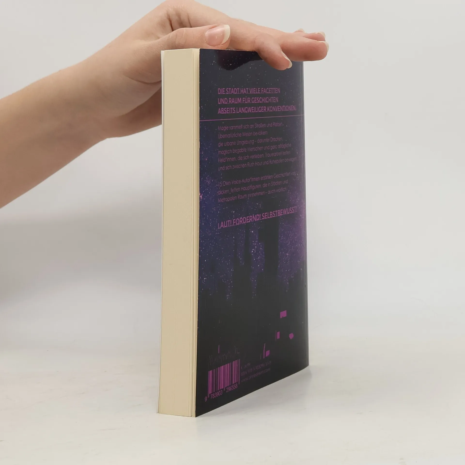 Die Stadt hat viele Facetten und Raum für Geschichten abseits langweiliger Konventionen: Magie sammelt sich an Straßen und Plätzen. Übernatürliche Wesen bevölkern die urbane Umgebung – darunter Drachen, magisch begabte Menschen und ganz alltägliche Held*innen, die sich verlieben, Trauerarbeit leisten und sich zwischen Rush Hour und Ruhepolen bewegen. 15 Own-Voice-Autor*innen erzählen Geschichten von dicken_fetten Hauptfiguren, die in Städten und Metropolen Raum einnehmen – auch wörtlich. Laut! Fordernd! Selbstbewusst!