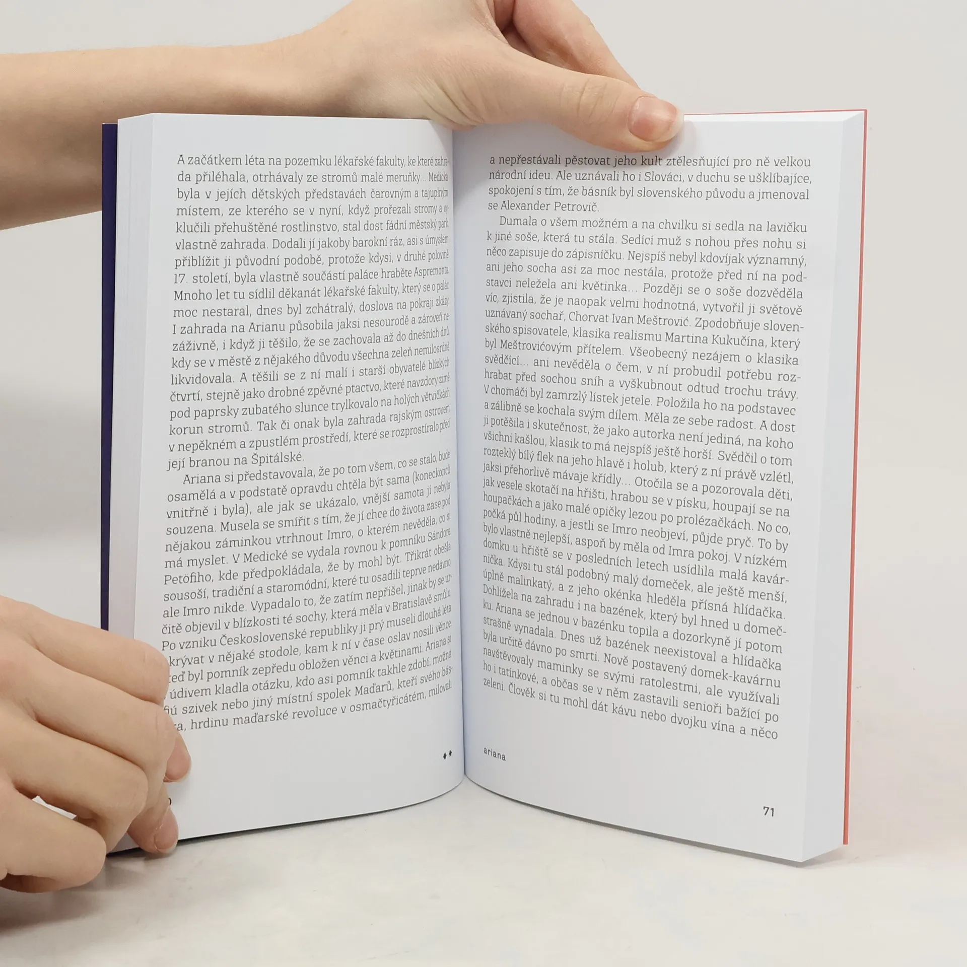 Neobvyklý, přitažlivý román současné slovenské spisovatelky o všedních dnech a snech zralé ženy. Ariana je ve věku prvních velkých životní bilancí. Po matčině smrti hledá novou cestu a láska zejména na začátku této pouti hraje určující roli. Mladší, energický a přitažlivý Marek je protipólem bývalého manžela, jehož přístup ke vztahům i k životu připomíná dnes čím dál grotesknější postavy dříve dominujících mužských typů. Poetické vyprávění o plynoucích dnech přinášejících nové možnosti se postupně prolíná s fantaskním světem vzpomínek a představ. Vytváří překvapivý, ale uvěřitelný svět bohatý na obrazy ženami obvykle navenek skrývané. Motiv knihy, která pro Ariana představuje způsob hledání i sebevyjádření, dostává pozoruhodný rámec v metafoře hvězdy, jejímž skutečným předobrazem je známý pražský letohrádek.
