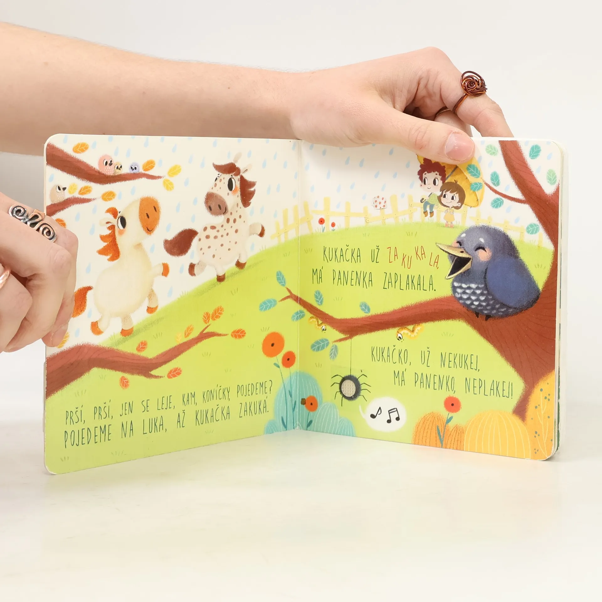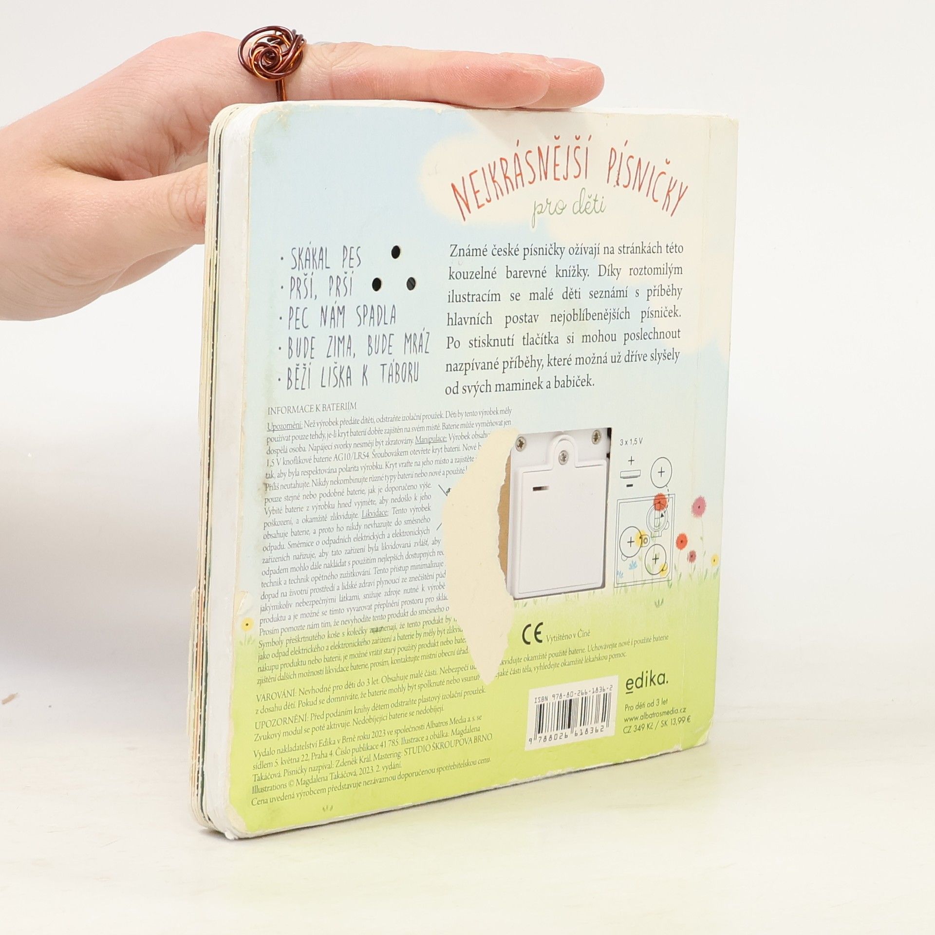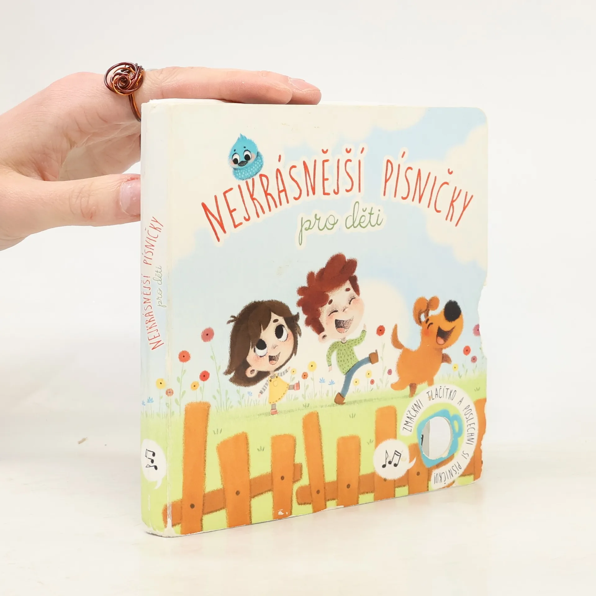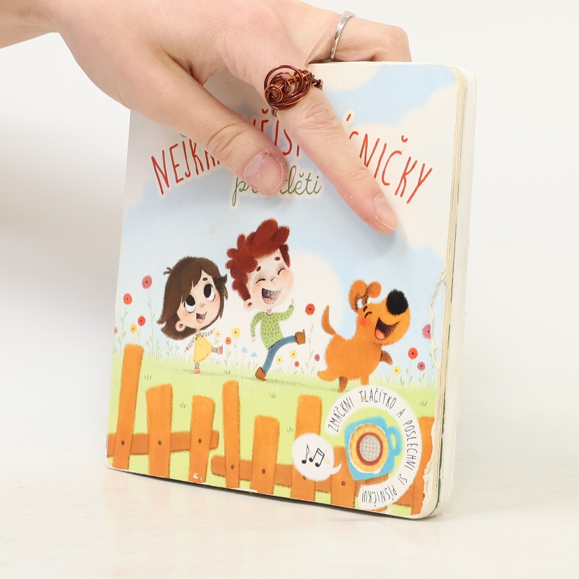 Známé české písničky ožívají na stránkách této kouzelné barevné knížky. Díky roztomilým ilustracím se malé děti seznámí s příběhy hlavních postav nejoblíbenějších písniček. Po stisknutí tlačítka si mohou poslechnout nazpívané příběhy (první sloka), které možná už dříve slyšely od svých maminek a babiček.