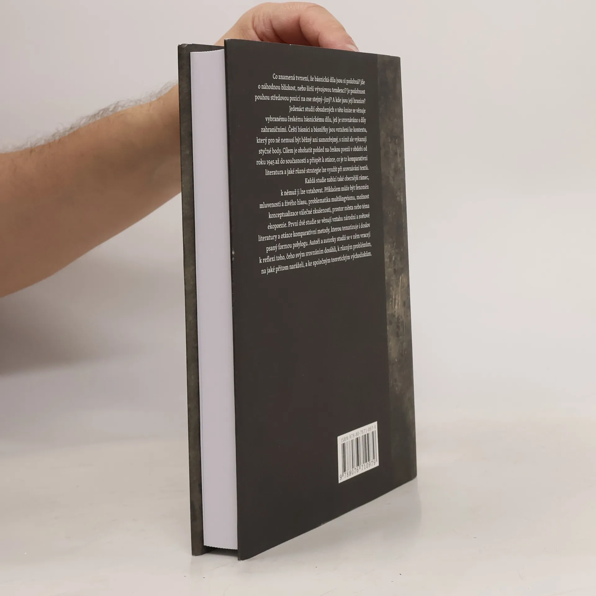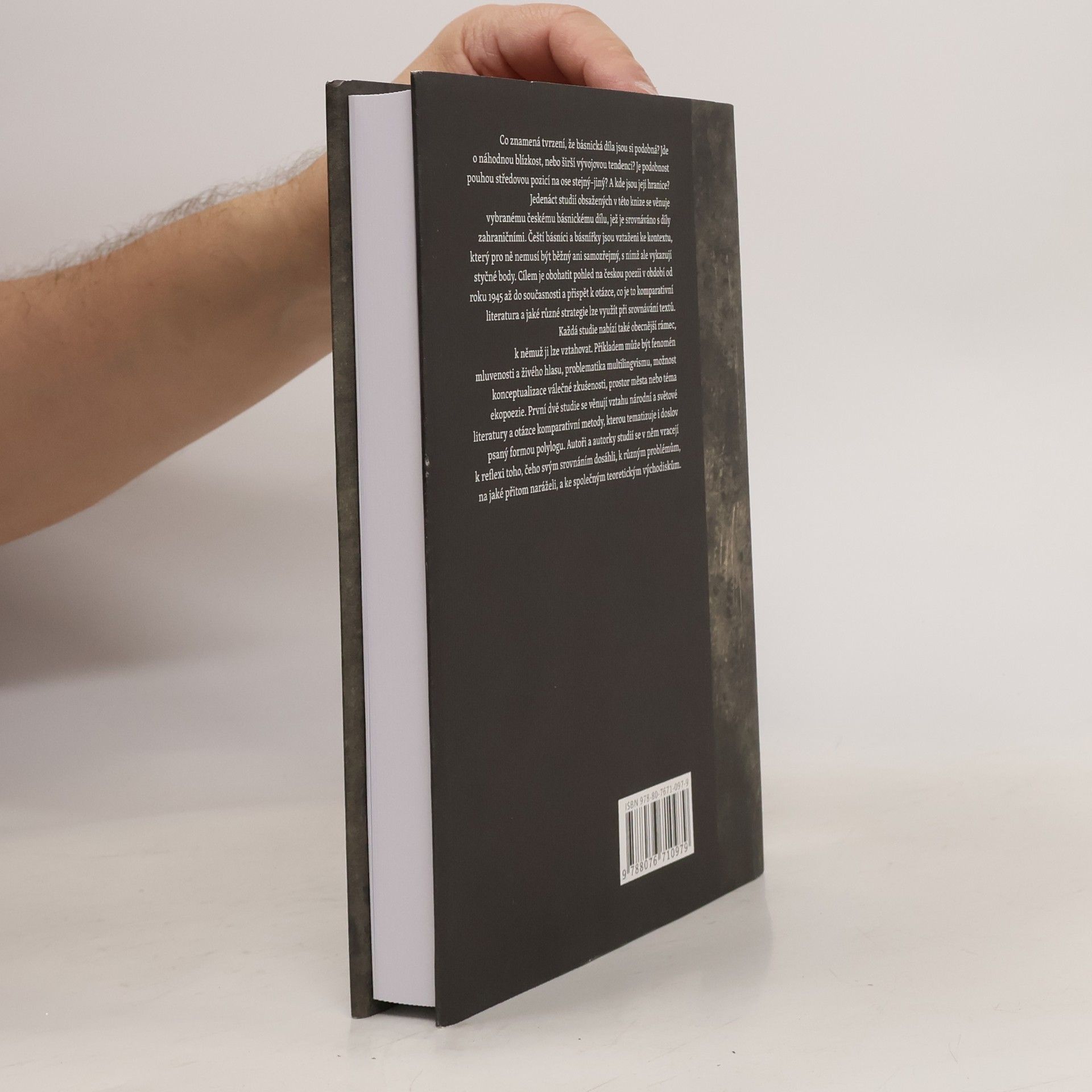 Co znamená tvrzení, že básnická díla jsou si podobná? Jde o náhodnou blízkost, nebo širší vývojovou tendenci? Je podobnost pouhou středovou pozicí na ose stejnýjiný? A kde jsou její hranice? Jedenáct studií obsažených v této knize se věnuje vybranému českému básnickému dílu, jež je srovnáváno s díly zahraničními. Čeští básníci a básnířky jsou vztaženi ke kontextu, který pro ně nemusí být běžný ani samozřejmý, s nímž ale vykazují styčné body. Cílem je obohatit pohled na českou poezii v období od roku 1945 až do současnosti a přispět k otázce, co je to komparativní literatura a jaké různé strategie lze využít při srovnávání textů. Každá studie nabízí také obecnější rámec, k němuž ji lze vztahovat. Příkladem může být fenomén mluvenosti a živého hlasu, problematika multilingvismu, možnost konceptualizace válečné zkušenosti, prostor města nebo téma ekopoezie. První dvě studie se věnují vztahu národní a světové literatury a otázce komparativní metody, kterou tematizuje i doslov psaný formou polylogu. Autoři a autorky studií se v něm vracejí k reflexi toho, čeho svým srovnáním dosáhli, k různým problémům, na jaké přitom naráželi, a ke společným teoretickým východiskům. Kniha analyzuje například díla Josefa Kainara, Jiřího Koláře, Ivana Blatného, Jana Skácela, Milana Nápravníka, Víta Janoty či Pavla Kolmačky, beatnickou, experimentální i konkrétní poezii.