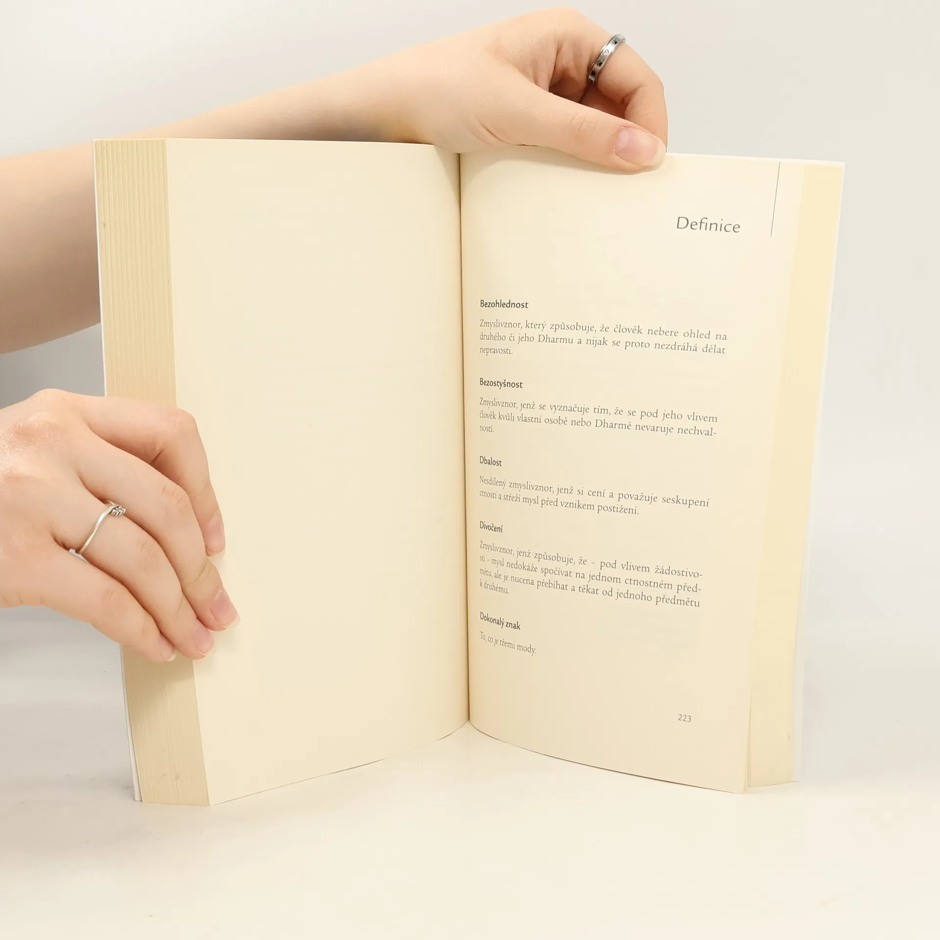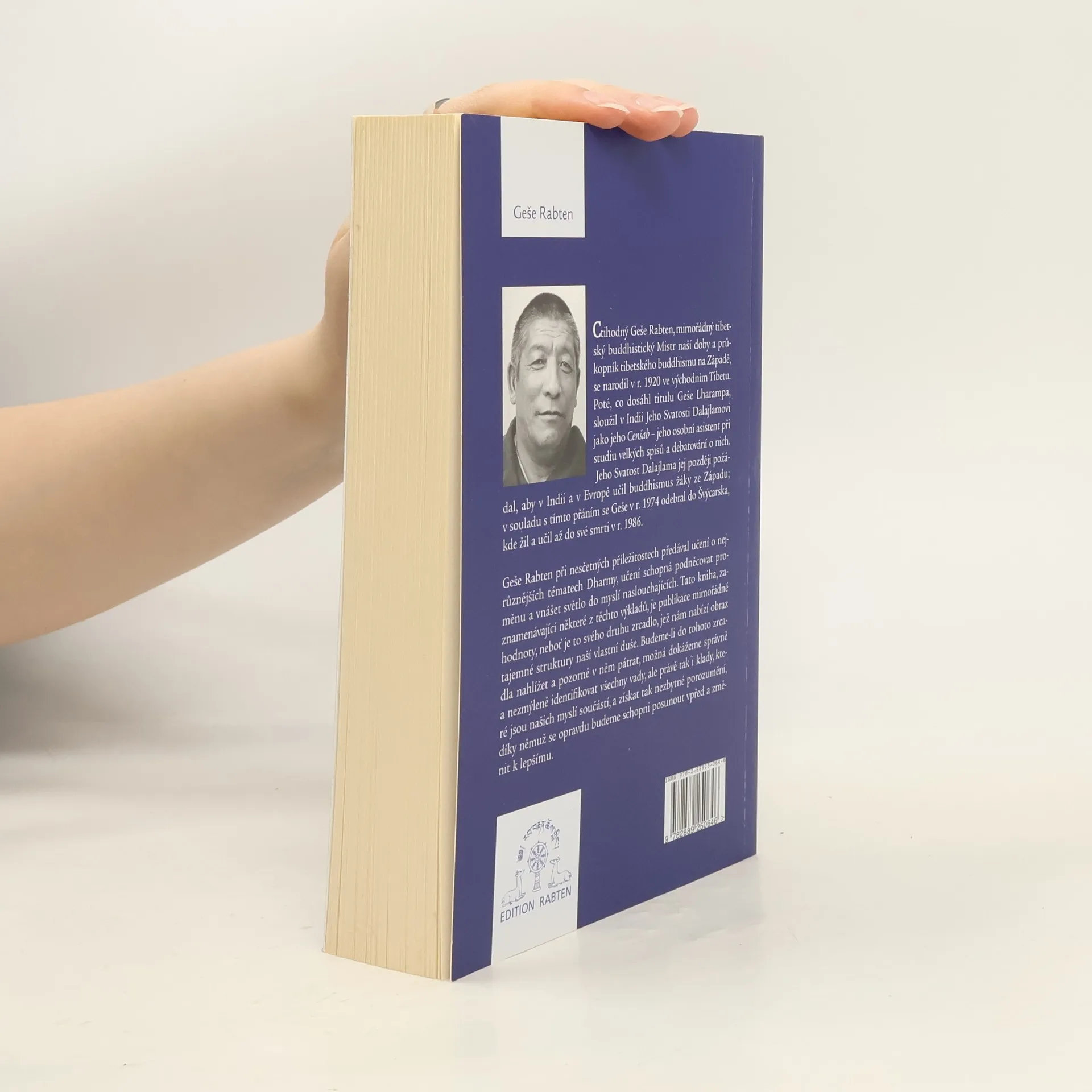 Ctihodný Geše Rabten, mimořádný tibetský buddhistický Mistr naší doby a průkopník tibetského buddhismu na Západě, se narodil v r. 1920 ve východním Tibetu. Poté, co dosáhl titulu Geše Lharampa, sloužil v Indii Jeho Svatosti Dalajlamovi jako jeho Cenšab – jeho osobní asistent při studiu velkých spisů a debatování o nich. Jeho Svatost Dalajlama jej později požádal, aby v Indii a v Evropě učil buddhismus žáky ze Západu; v souladu s tímto přáním se Geše v r. 1974 odebral do Švýcarska, kde žil a učil až do své smrti v r. 1986. Geše Rabten při nesčetných příležitostech předával učení o nejrůznějších tématech Dharmy, učení schopná podněcovat proměnu a vnášet světlo do myslí naslouchajících. Tato kniha, zaznamenávající některé z těchto výkladů, je publikace mimořádné hodnoty, neboť je to svého druhu zrcadlo, jež nám nabízí obraz tajemné struktury naší vlastní duše. Budeme-li do tohoto zrcadla nahlížet a pozorně v něm pátrat, možná dokážeme správně a nezmýleně identifikovat všechny vady, ale právě tak i klady, které jsou našich myslí součástí, a získat tak nezbytné porozumění, díky němuž se opravdu budeme schopni posunout vpřed a změnit k lepšímu.