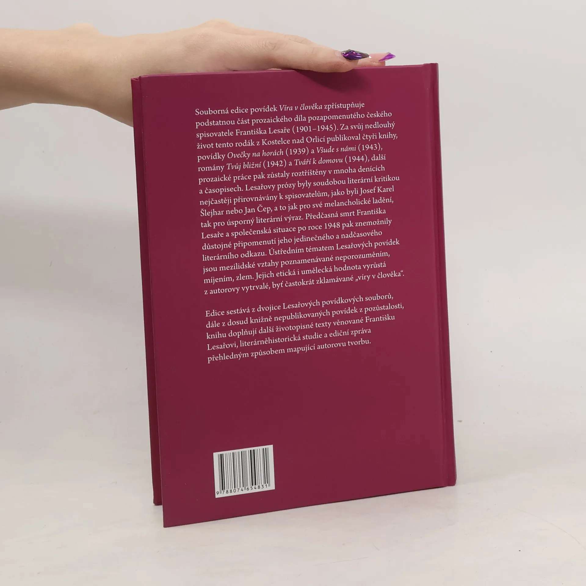 Souborná edice povídek Víra v člověka zpřístupňuje podstatnou část prozaického díla pozapomenutého českého spisovatele Františka Lesaře (1901–1945). Za svůj nedlouhý život tento rodák z Kostelce nad Orlicí publikoval čtyři knihy, povídky Ovečky na horách (1939) a Všude s námi (1943), romány Tvůj bližní (1942) a Tváří k domovu (1944), další prozaické práce pak zůstaly roztříštěny v mnoha denících a časopisech. Lesařovy prózy byly soudobou literární kritikou nejčastěji přirovnávány k spisovatelům, jako byli Josef Karel Šlejhar nebo Jan Čep, a to jak pro své melancholické ladění, tak pro úsporný literární výraz. Předčasná smrt Františka Lesaře a společenská situace po roce 1948 pak znemožnily důstojné připomenutí jeho jedinečného a nadčasového literárního odkazu. Ústředním tématem Lesařových povídek jsou mezilidské vztahy poznamenávané neporozuměním, míjením, zlem. Jejich etická i umělecká hodnota vyrůstá z autorovy vytrvalé, byť častokrát zklamávané „víry v člověka“. Edice sestává z dvojice Lesařových povídkových souborů, dále z dosud knižně nepublikovaných povídek z pozůstalosti, knihu doplňují další životopisné texty věnované Františku Lesařovi, literárněhistorická studie a ediční zpráva přehledným způsobem mapující autorovu tvorbu.