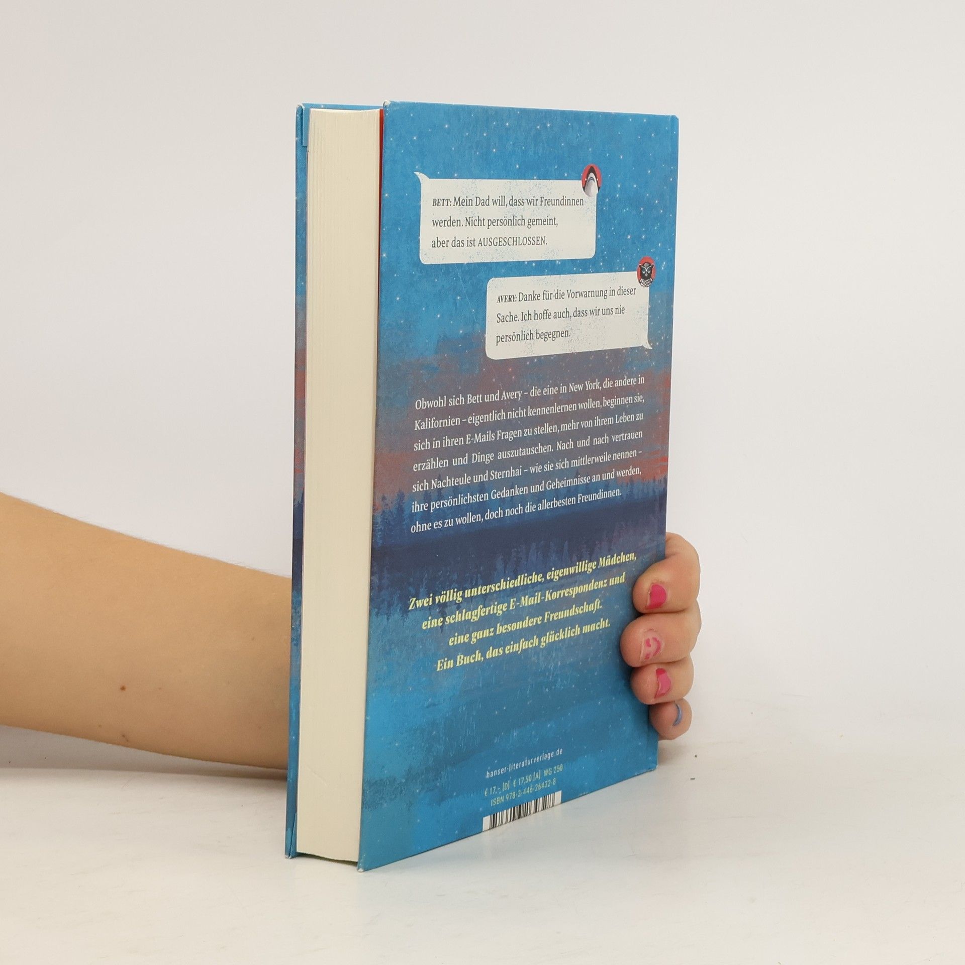 Die schönste Freundschaftsgeschichte und der genialste Dialog seit „Gut gegen Nordwind“. Von den Bestsellerautorinnen Holly Goldberg Sloan und Meg Wolitzer Achtung, Suchtpotential! Diesem Buch verfällt der glückliche Leser mit ganzem Herzen ab der ersten Seite. „Du kennst mich nicht, aber ich schreibe dir trotzdem.“ So beginnt die Geschichte von Bett und Avery, deren alleinerziehende Väter die verrückte, romantische Idee haben, dass sie eine Familie werden könnten. Nicht mit Bett und Avery! Obwohl sich die beiden Mädchen auf gar keinen Fall kennenlernen wollen, beginnen sie vor lauter Neugierde, in ihren E-Mails Fragen zu stellen, mehr von ihren Leben zu erzählen und Dinge auszutauschen. Nach und nach vertrauen sich Nachteule und Sternhai – wie sie sich mittlerweile nennen – ihre persönlichsten Gedanken und Geheimnisse an und können sich ein Leben ohne einander nicht mehr vorstellen.
