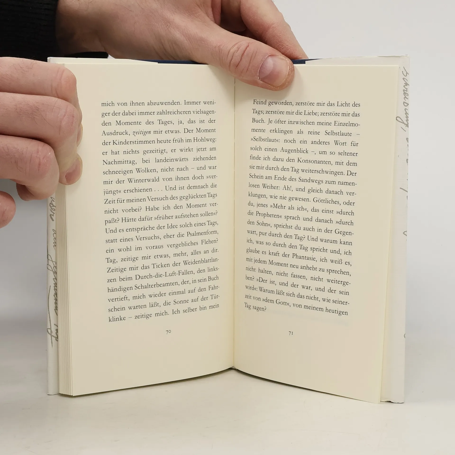 Der Versuch über den geglückten Tag, »Ein Wintertagtraum«, hat ein Motto aus dem Römerbrief: »Der den Tag denkt, denkt dem Herrn.« Der geglückte Tag ist ein Abenteuer mit dem Tag als Gegenüber, als Gegner. Die »Expedition Tag« gibt Einzelmomenten einen Zusammenhang eben durch die Stimme des Erzählers. »Carpe diem«, der Spruch des Horaz, wird hier neu übersetzt mit »Pflücke den Tag«, ganz so, wie der Erzähler sein Problem sieht: aus den geglückten Augenblicken, als vierte Macht, den geglückten Tag zu pflücken. »Wie viel mehr wäre mit dem Tag zu machen, mit nichts als dem. Und jetzt, in meinem Leben, in deinem, in unser beiden Epoche, ist sein Momentum … Wenn ich es nicht jetzt mit dem Tag versuche, dann habe ich seine Möglichkeiten auf Dauer verspielt …«
