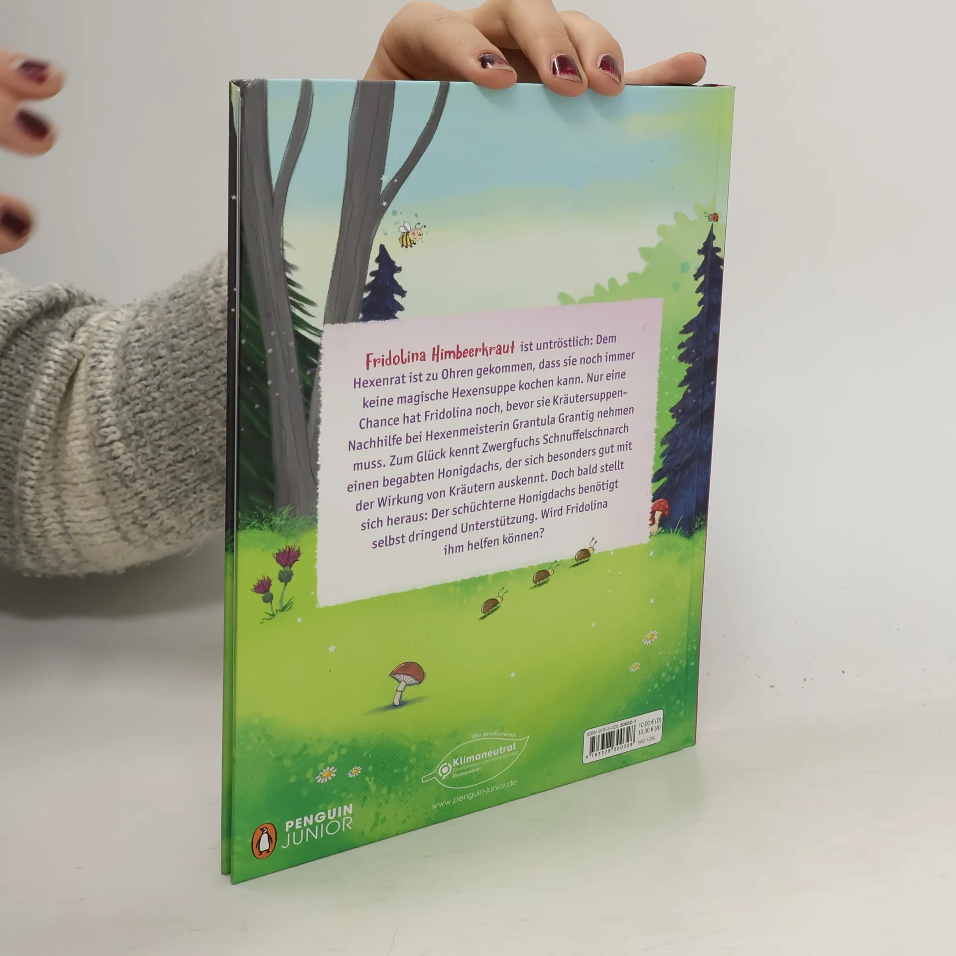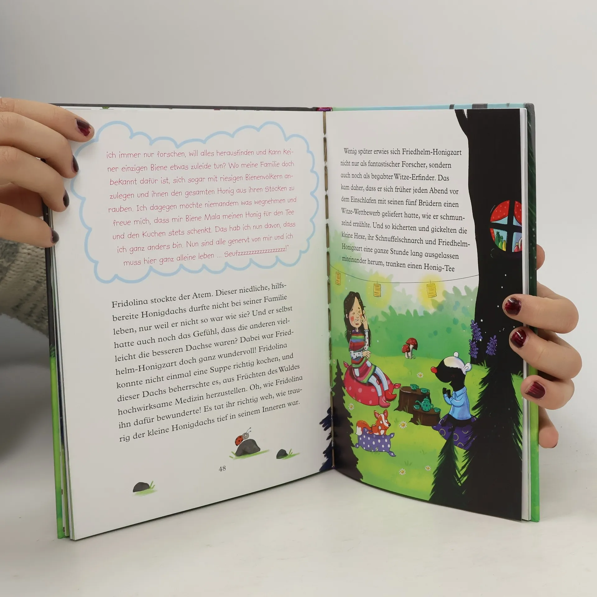 Kleine Hexe – großer Mut: Vom Glück, dass jeder wunderbar ist Der Hexenrat wird ungeduldig: Wie kann es sein, dass Fridolina keine einzige magische Kräutersuppe kochen kann? Ihre Erinnerungssuppe führt dazu, dass alle Hexen nur noch rückwärts sprechen, und nach dem Genuss der Entspannungssuppe wachsen ihnen lange Bärte. Verzweifelt versucht Fridolina mit Zwergfuchs Schnuffelschnarch das Kraut für die dritte Suppe zu finden – diese Suppe ist ihre letzte Chance, bevor sie zur Kräutersuppennachhilfe geschickt wird. Bei Friedhelm, dem Honigdachs, suchen sie Rat. Er ist besonders gut darin, mit Kräutern medizinische Tinkturen herzustellen. Doch bald stellt sich heraus: Der schüchterne Honigdachs selbst benötigt Unterstützung. Er ist anders als alle anderen Honigdachse seiner Familie und wird deswegen ausgegrenzt. Wird Fridolina ihm helfen können? Ausstattung: Mit fbg. Illustrationen