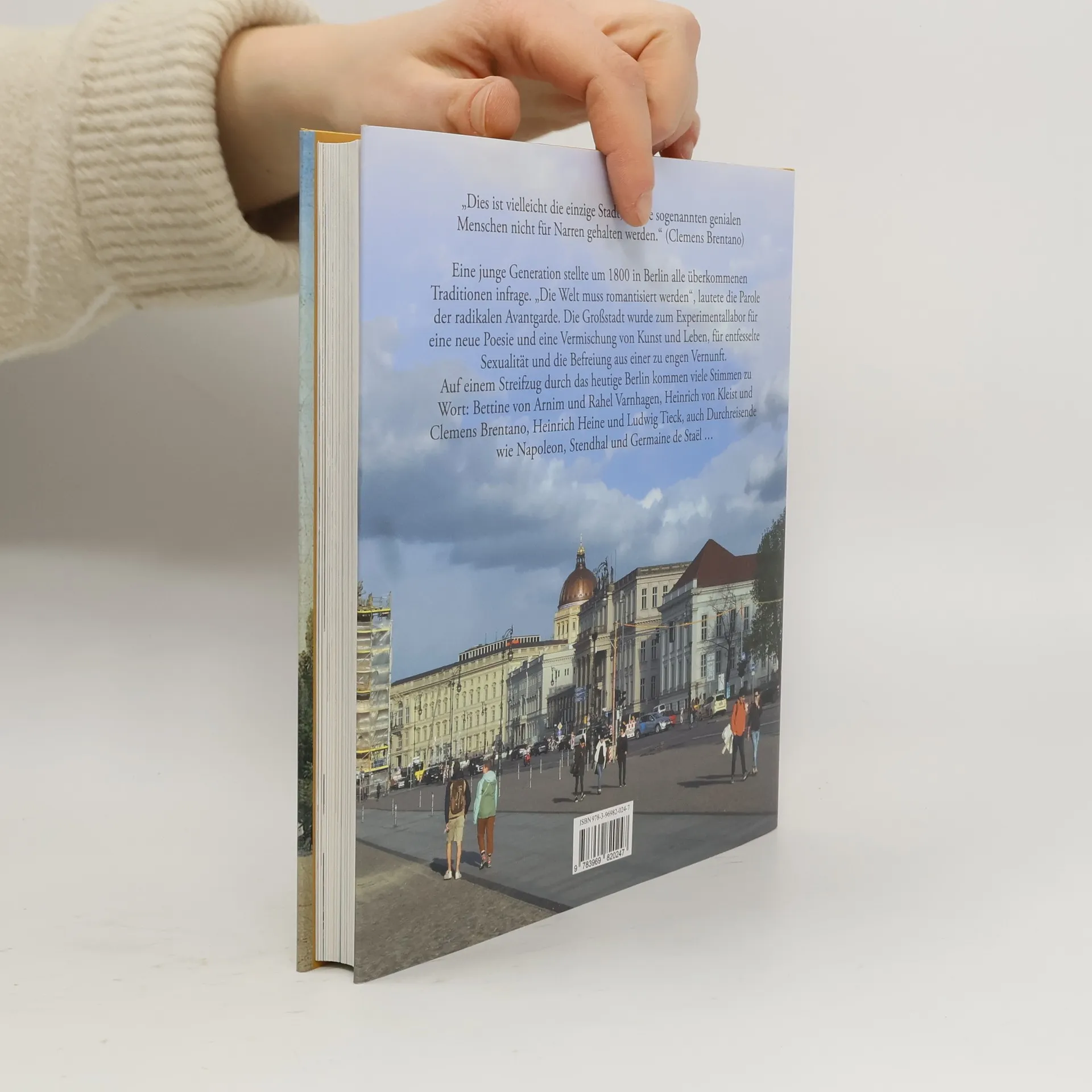 Eine junge Generation stellte um 1800 in Berlin alle überkommenen Traditionen infrage. „Die Welt muss romantisiert werden“, lautete die Parole der radikalen Avantgarde. Die junge Großstadt wurde zum Experimentallabor für eine neue Poesie und eine Vermischung von Kunst und Leben, für entfesselte Sexualität und die Befreiung aus einer zu engen Vernunft. Männer- und Frauenrollen kamen auf den Prüfstand und wurden neu ausbalanciert. Im sechsten Band der Buchreihe Literarische Schauplätze wandert ein Stadtführer mit Siebenmeilenstiefeln durch das heutige Berlin. Er sucht nach sichtbaren Spuren der Romantik und fragt: Was hat es mit dem Kleisthaus und der Eichendorffgasse, mit dem Dorothea-Schlegel-Platz oder dem Humboldt Forum auf sich? Wo waren die Treffpunkte romantischer Netzwerke? Welche Orte inspirierten vor 200 Jahren zu verträumten oder frechen Texten über Berlin? Auf dem romantisierenden Streifzug kommen viele Stimmen zu Wort: Bettine von Arnim und Rahel Varnhagen, Goethe und Schiller, Heine und Tieck, Kleist und Eichendorff, auch Durchreisende wie Napoleon, Stendhal und Germaine de Staël.