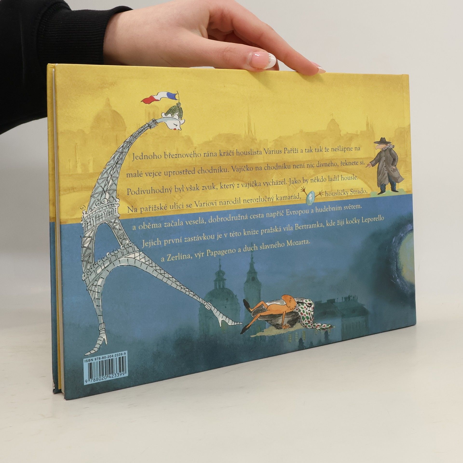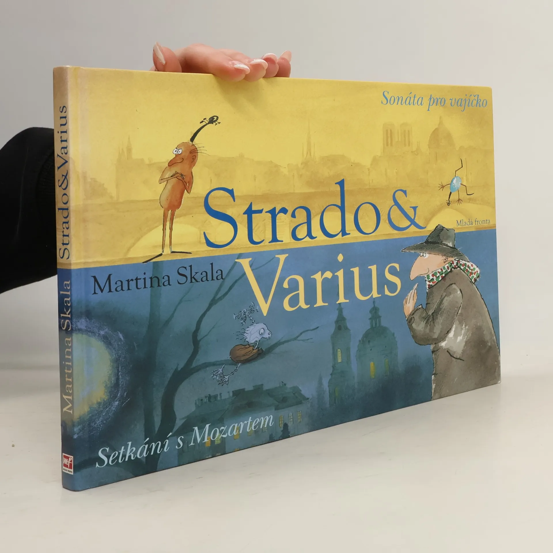 Nové vydání cenami ověnčených knih o hlavních hrdinech jménem Strado a Varius, kteří nás provedou zákoutími hudby a ukážou, co je to přátelství. Jednoho březnového rána kráčí houslista Varius Paříží a tak tak že nešlápne na malé vejce uprostřed chodníku. Vajíčko na chodníku není nic divného, řeknete si. Podivuhodný byl však zvuk, který z vajíčka vycházel. Jako by někdo ladil housle. Na pařížské ulici se Variovi narodil nerozlučný kamarád, housličky Strado, a oběma začala veselá, dobrodružná cesta napříč Evropou a hudebním světem. Jejich první zastávkou je v této knize pražská vila Bertramka, kde žijí kočky Leporello a Zerlina, výr Papageno a duch slavného Mozarta.